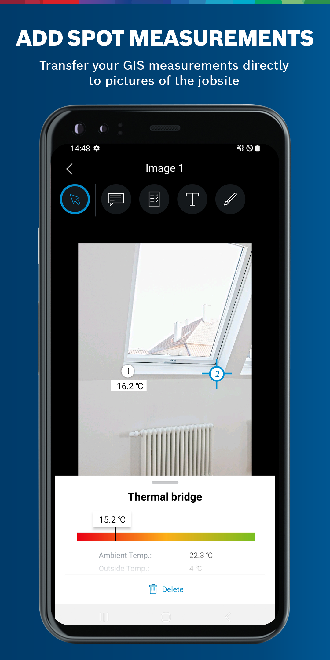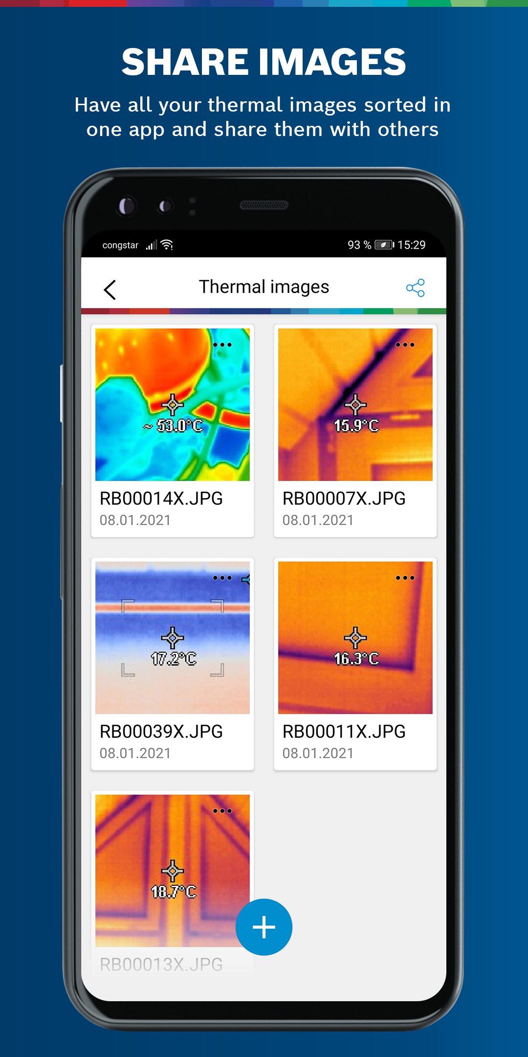 The ThermalOn app enables convenient documentation of all temperature measurements from the Bosch GTC thermal imaging camera and the Bosch GIS 1000 C Professional infrared thermometer via smartphone or tablet.