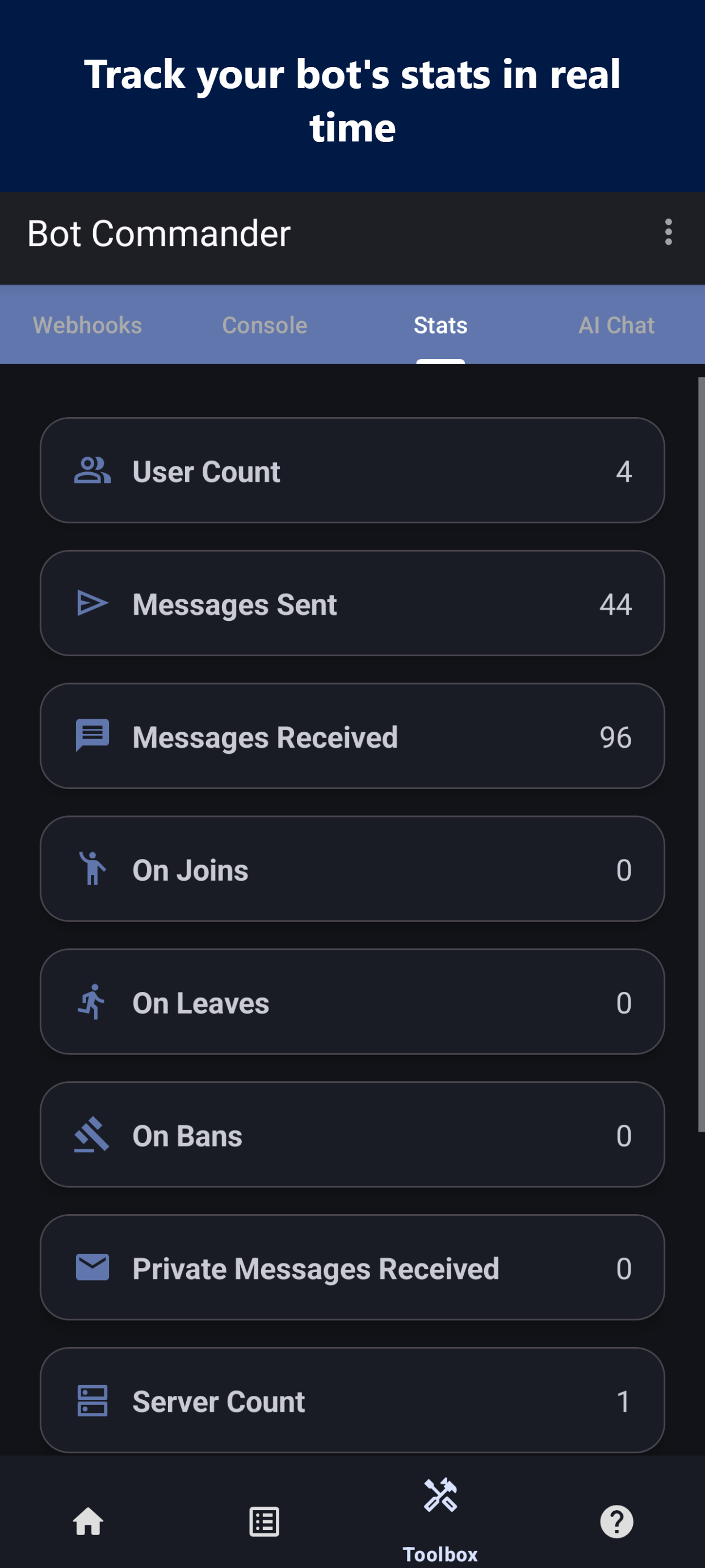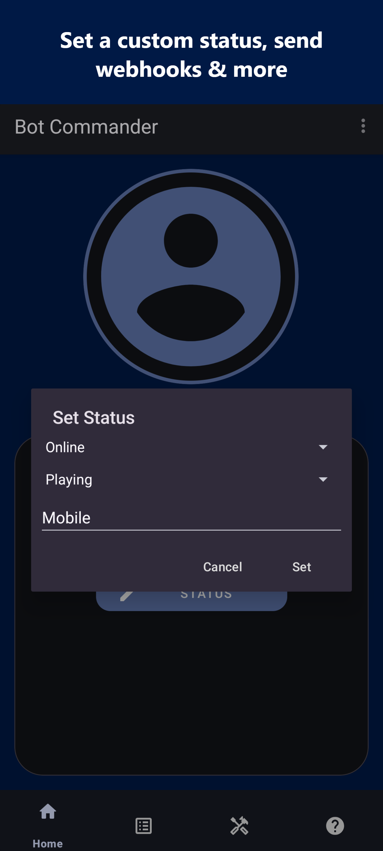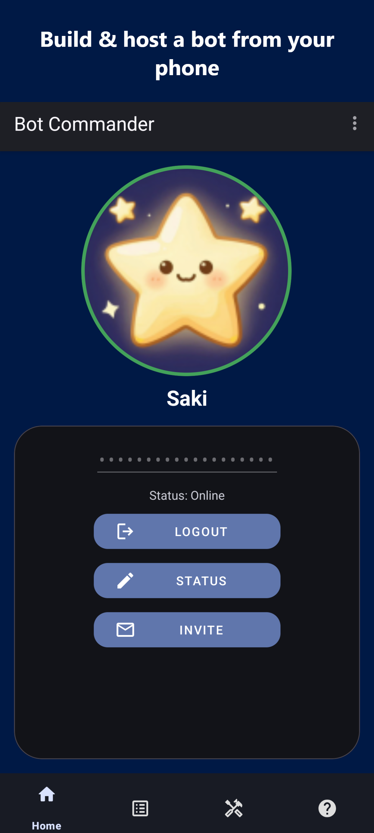Build, customize, and host a bot for Discord — entirely from your phone. No PC, no cloud server. Your bot runs directly on your device with no time limits. No-Code Command Builder Create powerful commands without writing a single line of code. Choose from 17 actions — send embeds, assign roles, kick/ban members, bulk delete messages, auto-moderate, and more. 65+ Dynamic Keywords Make every response unique. Insert usernames, avatars, server stats, random selections, timestamps, math, and more using simple $keywords. Built-in AI Responses Connect your API key and give your bot AI-powered replies with the $chat() keyword. Set custom developer prompts to shape your bot's personality. JavaScript Scripting Need full control? Write custom logic with the built-in JavaScript engine, live code console, and startup scripts. 6 Event Triggers Respond to more than messages. Trigger commands on DMs, reactions, member joins, leaves, and bans. Moderation Suite Kick, ban, voice mute, restrict commands by role or admin status, and auto-delete messages — all configurable per command. Webhooks, Embeds & Custom Status Send rich embeds with images and colors. Post webhook messages. Set bot statuses like "Watching...", "Streaming...", or "Competing..." Manage Like a Pro Save command sets as configurations and swap between them. Archive, clone, and import/export. Live Statistics Track messages sent, users reached, commands executed, server count, and more from a real-time dashboard.