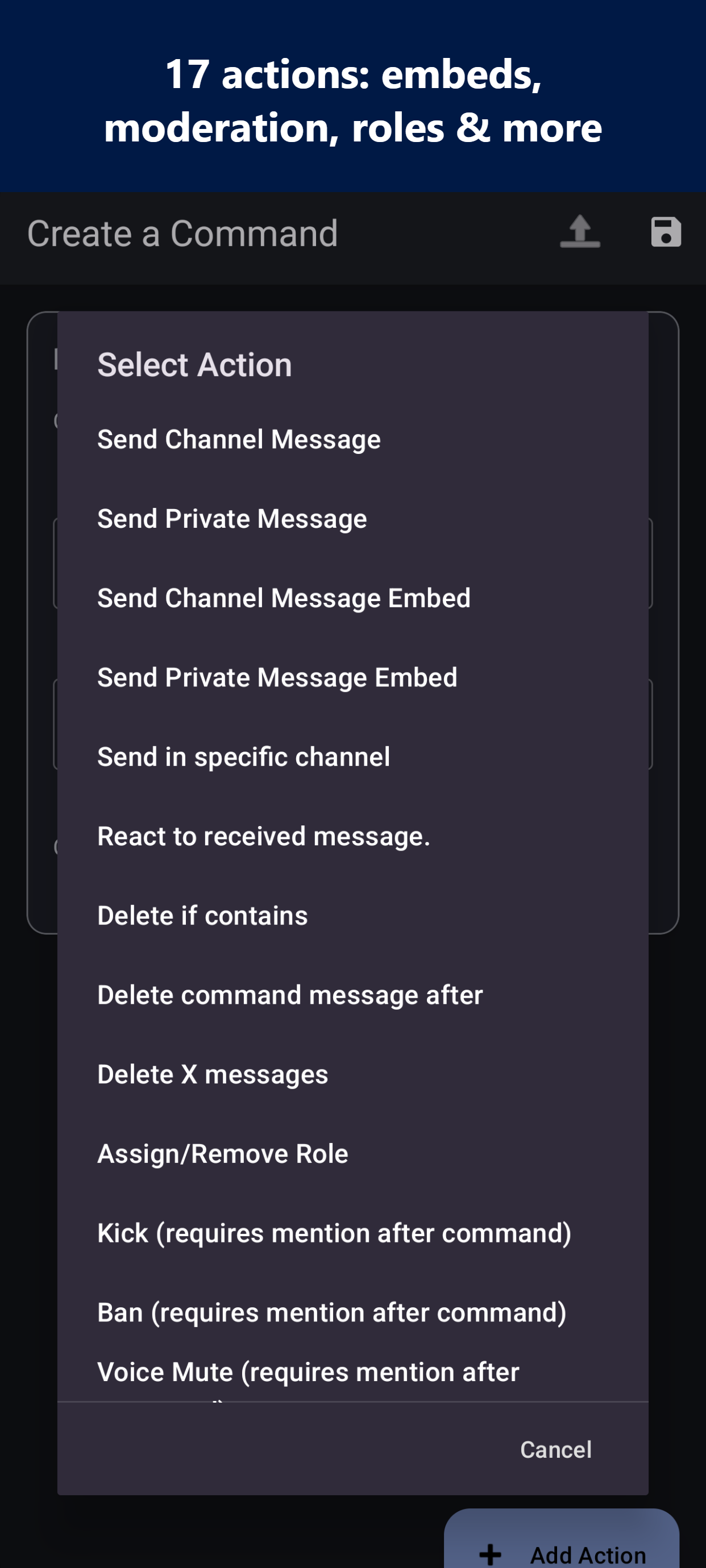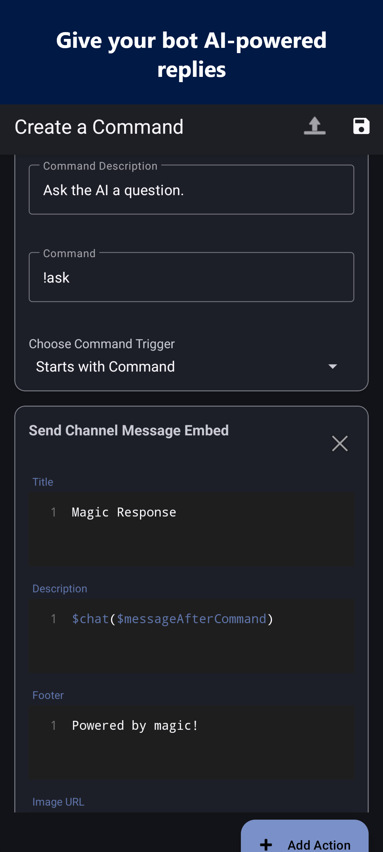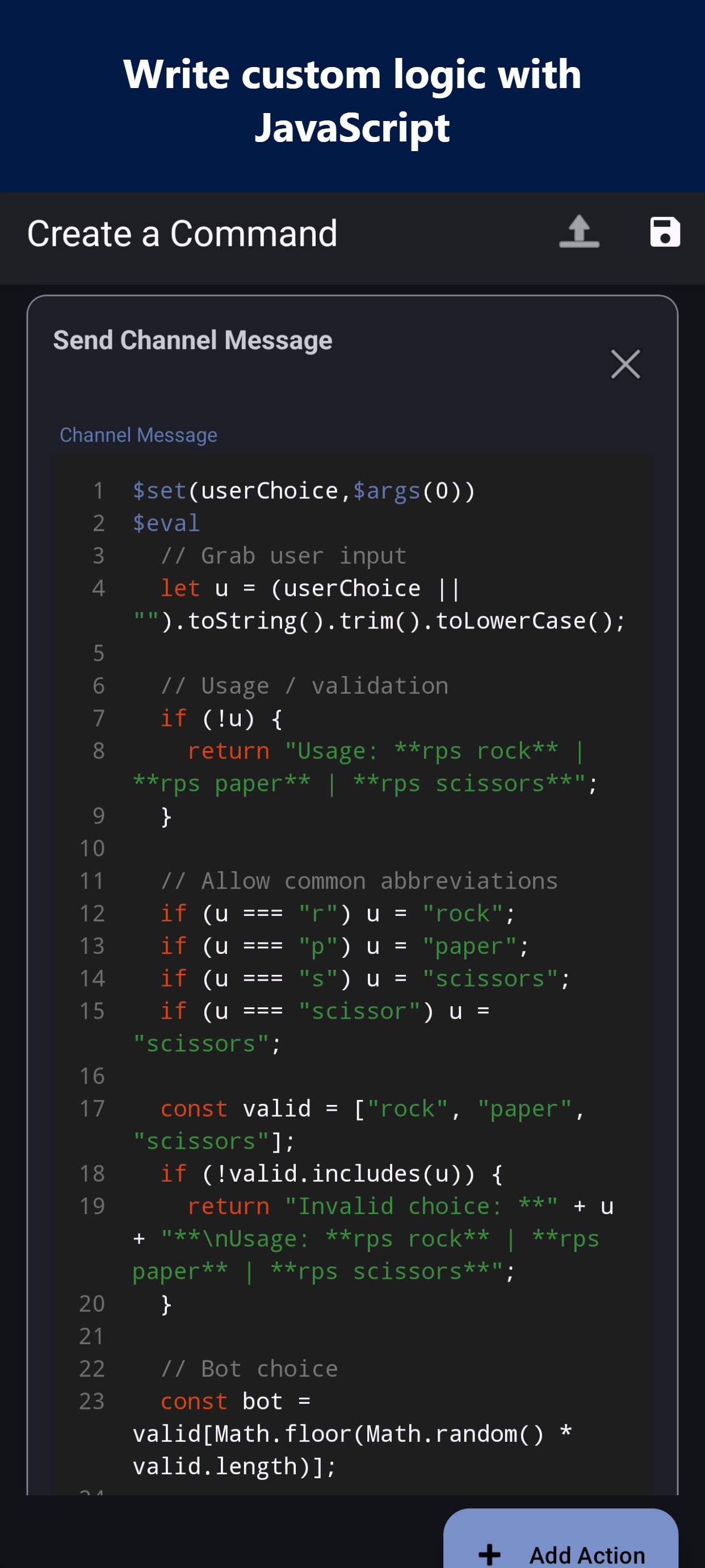 Build, customize, and host a bot for Discord — entirely from your phone. No PC, no cloud server. Your bot runs directly on your device with no time limits. No-Code Command Builder Create powerful commands without writing a single line of code. Choose from 17 actions — send embeds, assign roles, kick/ban members, bulk delete messages, auto-moderate, and more. 65+ Dynamic Keywords Make every response unique. Insert usernames, avatars, server stats, random selections, timestamps, math, and more using simple $keywords. Built-in AI Responses Connect your API key and give your bot AI-powered replies with the $chat() keyword. Set custom developer prompts to shape your bot's personality. JavaScript Scripting Need full control? Write custom logic with the built-in JavaScript engine, live code console, and startup scripts. 6 Event Triggers Respond to more than messages. Trigger commands on DMs, reactions, member joins, leaves, and bans. Moderation Suite Kick, ban, voice mute, restrict commands by role or admin status, and auto-delete messages — all configurable per command. Webhooks, Embeds & Custom Status Send rich embeds with images and colors. Post webhook messages. Set bot statuses like "Watching...", "Streaming...", or "Competing..." Manage Like a Pro Save command sets as configurations and swap between them. Archive, clone, and import/export. Live Statistics Track messages sent, users reached, commands executed, server count, and more from a real-time dashboard.