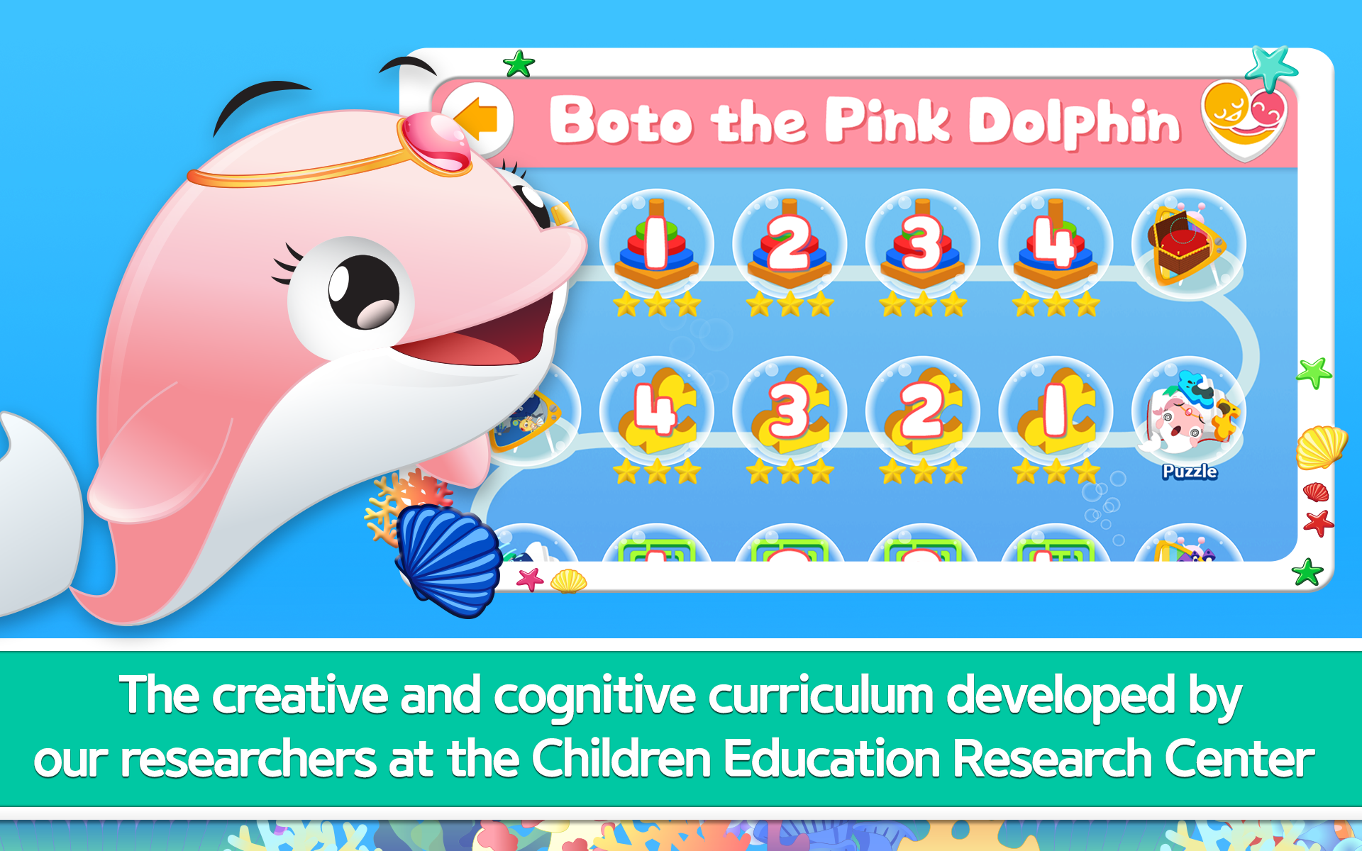 Boto the Pink Dolphin is an educational game for kids aged 3 to 6 based on a curriculum developed by an institution specialized in early childhood education. Join cute pink dolphin Boto and his aquatic friends for exciting adventures in the mysterious underwater world!