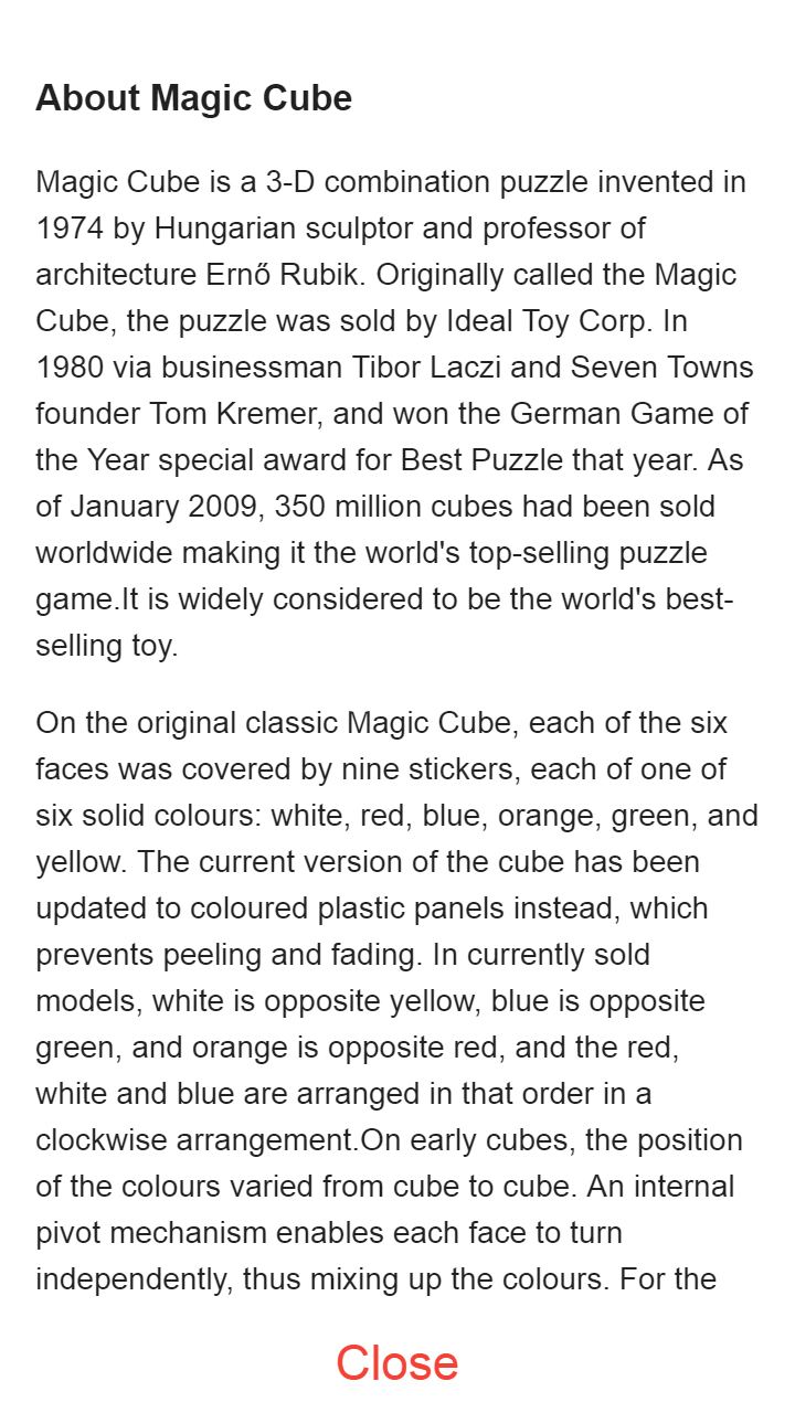Cubo mágico agora no seu celular! tente resolver o cubo mágico no mínimo de movimentos e tempo possíveis. ** Características ** - É 3D para que você possa girá-lo em qualquer direção com a ponta do dedo - Cores aprimoradas - Seleção de nível de iniciante a profissional - Etapas incluídas sobre como resolver o cubo mágico - É grátis! ** Sobre o Cubo Mágico ** O Cubo Mágico é um quebra-cabeça de combinação 3D inventado em 1974 pelo escultor e professor de arquitetura húngaro. Originalmente chamado de Cubo Mágico, o quebra-cabeça foi vendido pela Ideal Toy Corp. Em 1980, ganhou o prêmio especial de Jogo do Ano Alemão de Melhor Quebra-cabeça naquele ano. Em janeiro de 2009, 350 milhões de cubos foram vendidos em todo o mundo, tornando-o o jogo de quebra-cabeça mais vendido do mundo. É amplamente considerado o brinquedo mais vendido do mundo. No Cubo Mágico clássico original, cada uma das seis faces era coberta por nove adesivos, cada um de uma das seis cores sólidas: branco, vermelho, azul, laranja, verde e amarelo. A versão atual do cubo foi atualizada para painéis de plástico coloridos, o que evita descamação e desbotamento. Nos modelos vendidos atualmente, o branco é o oposto do amarelo, o azul é o oposto do verde e o laranja é o oposto do vermelho, e o vermelho, branco e azul são organizados nessa ordem no sentido horário. Nos primeiros cubos, a posição das cores variava de cubo para cubo. Um mecanismo de pivô interno permite que cada face gire de forma independente, misturando as cores. Para que o quebra-cabeça seja resolvido, cada face deve ser devolvida para ter apenas uma cor. Quebra-cabeças semelhantes já foram produzidos com vários números de lados, dimensões e adesivos. Embora o Cubo Mágico tenha atingido seu auge de popularidade na década de 1980, ainda é amplamente conhecido e usado. Muitos speedcubers continuam praticando e quebra-cabeças semelhantes: eles também competem pelos tempos mais rápidos em várias categorias. Desde 2003, a World Cube Association, o órgão internacional do Cubo Mágico, organiza competições em todo o mundo e reconhece recordes mundiais.