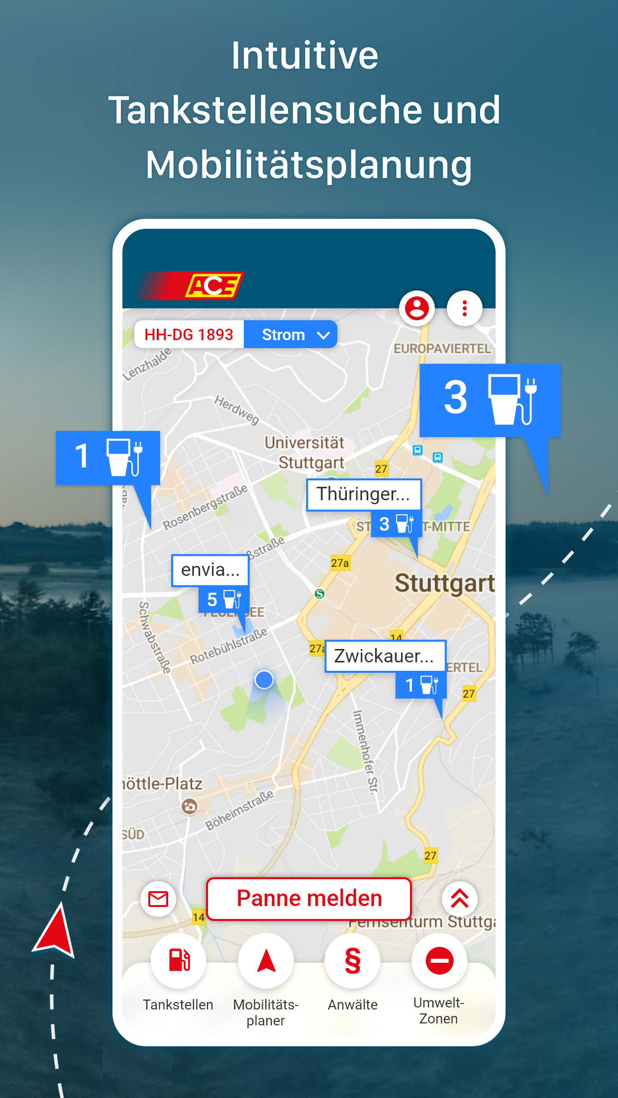 Planejamento de rotas intuitivo, zonas ambientais alemãs, informações sobre o país e a loja de vinhetas ACE completam a oferta do aplicativo ACE.