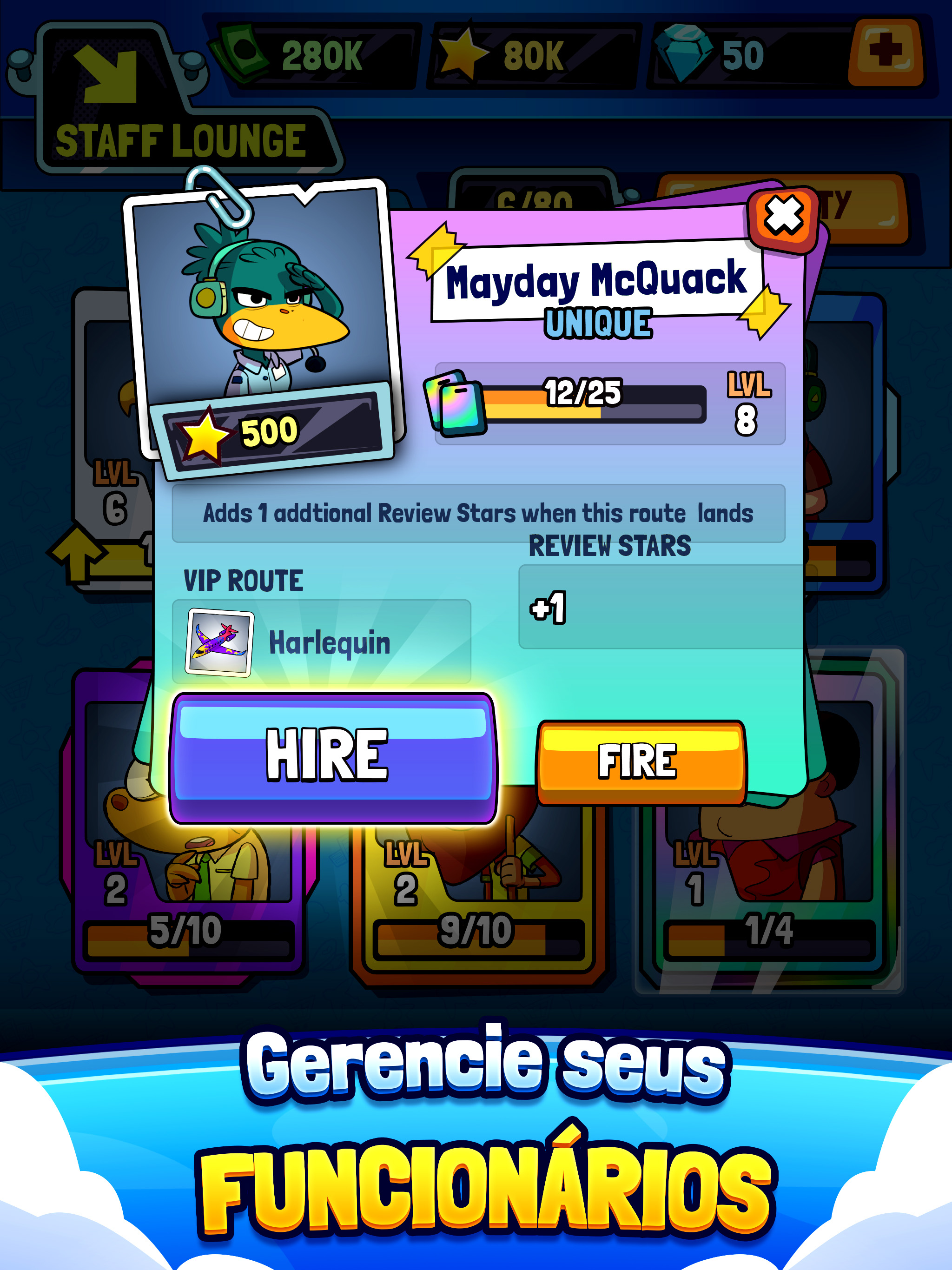 Automatize seu aeroporto para conseguir ainda mais dinheiro com sua equipe recém-contratada. Colete e suba o nível dos seus trabalhadores, incluindo pilotos, funcionários de serviços, tripulantes e muito mais!