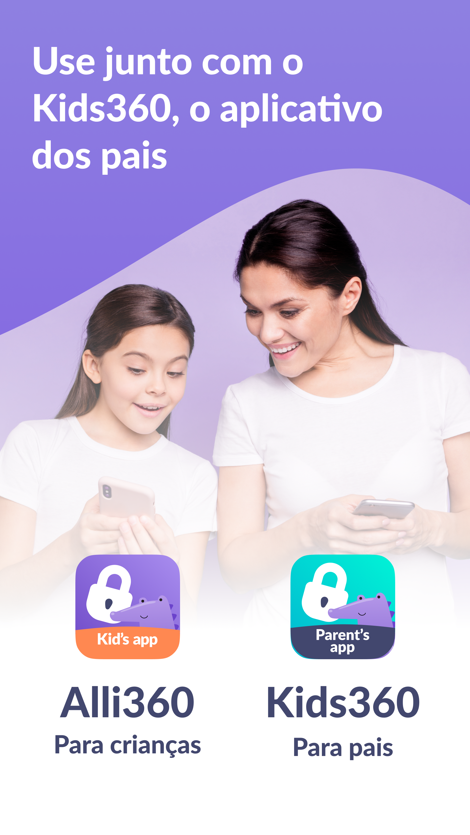 O aplicativo Alli360 complementa o aplicativo "Kids360 for Parents" e deve ser instalado no dispositivo que o adolescente está usandoEste aplicativo oferece as seguintes opções: