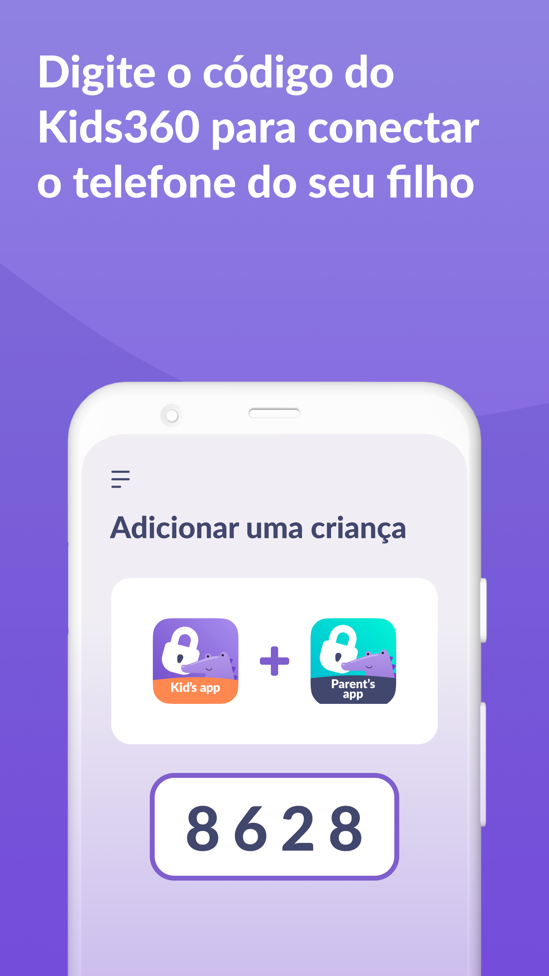 2. Instale o aplicativo “Kids360” no telefone do seu filho adolescente e digite o código do link com o dispositivo dos pais;