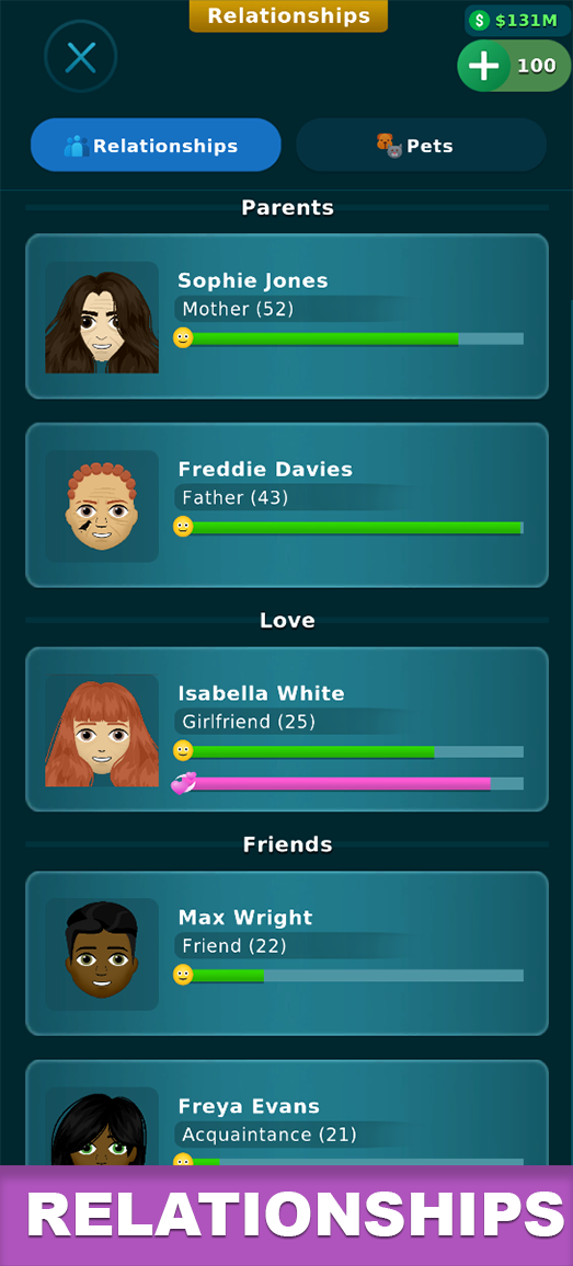 🌟 Sua história. Suas escolhas. Seu AltLife. 🌟 Mergulhe no AltLife, onde cada decisão molda sua jornada de vida única. 📖 Simulação de vida dinâmica Graças aos nossos eventos aleatórios exclusivos, não há duas histórias de vida iguais. Cada jogabilidade oferece uma experiência distinta de simulador de vida. 👩💼 Diversas oportunidades de trabalho Desde o início como lava-louças até a ascensão como CEO, AltLife apresenta uma vasta gama de empregos e planos de carreira. 📱 Carreiras interativas Faça ondas no Utoob, seja notado no Instafame ou mergulhe no mercado de criptomoedas. O smartphone do jogo da AltLife desbloqueia diversas oportunidades de carreira. 💞 Relacionamentos realistas Em nosso simulador de vida, os relacionamentos desempenham um papel fundamental. Envolva-se, nutra e veja como cada interação molda sua história de vida. 🎲 Atividades envolventes A vida no AltLife não é apenas sobre trabalho. Jogue na loteria, faça compras e explore uma infinidade de atividades projetadas para enriquecer sua experiência no simulador de vida. 🎒 Colete e utilize itens Descubra, colete e use uma variedade de itens no jogo que podem mudar o curso da sua história de vida. 💎 Acumule ativos valiosos Sejam carros de luxo, iates ou imóveis, faça investimentos estratégicos e veja seus ativos crescerem. Pouco a pouco, a vida se desenrola de inúmeras maneiras inesperadas. Ícones cortesia de: icons8.com