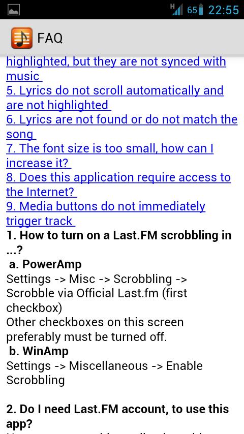 * Keeps lyrics of listened songs in the internal memory, so it doesn't have to download them from the Internet again