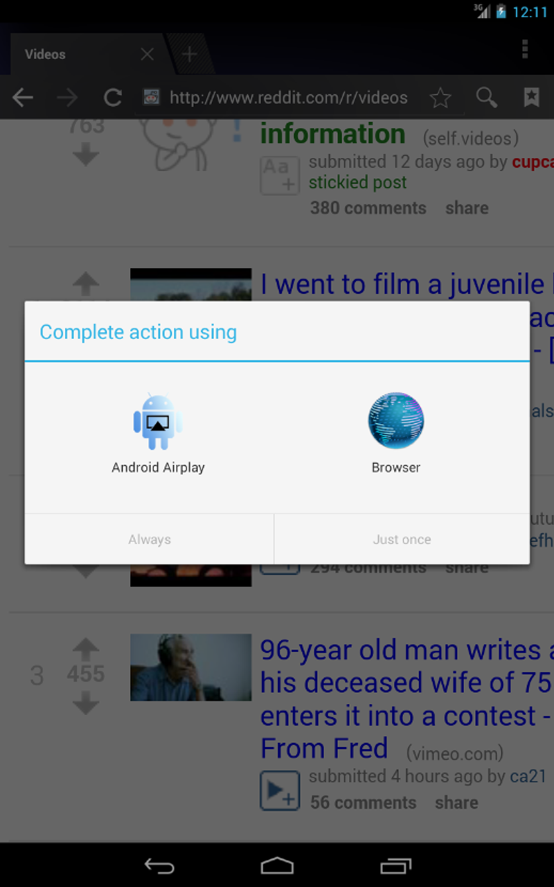 Youtube videos and mp4 files can be sent by opening or sharing via Android Airplay.