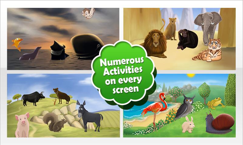 * 40+ animals in 8 different scenes with animals from farm, zoo, jungle, and there are pets too!