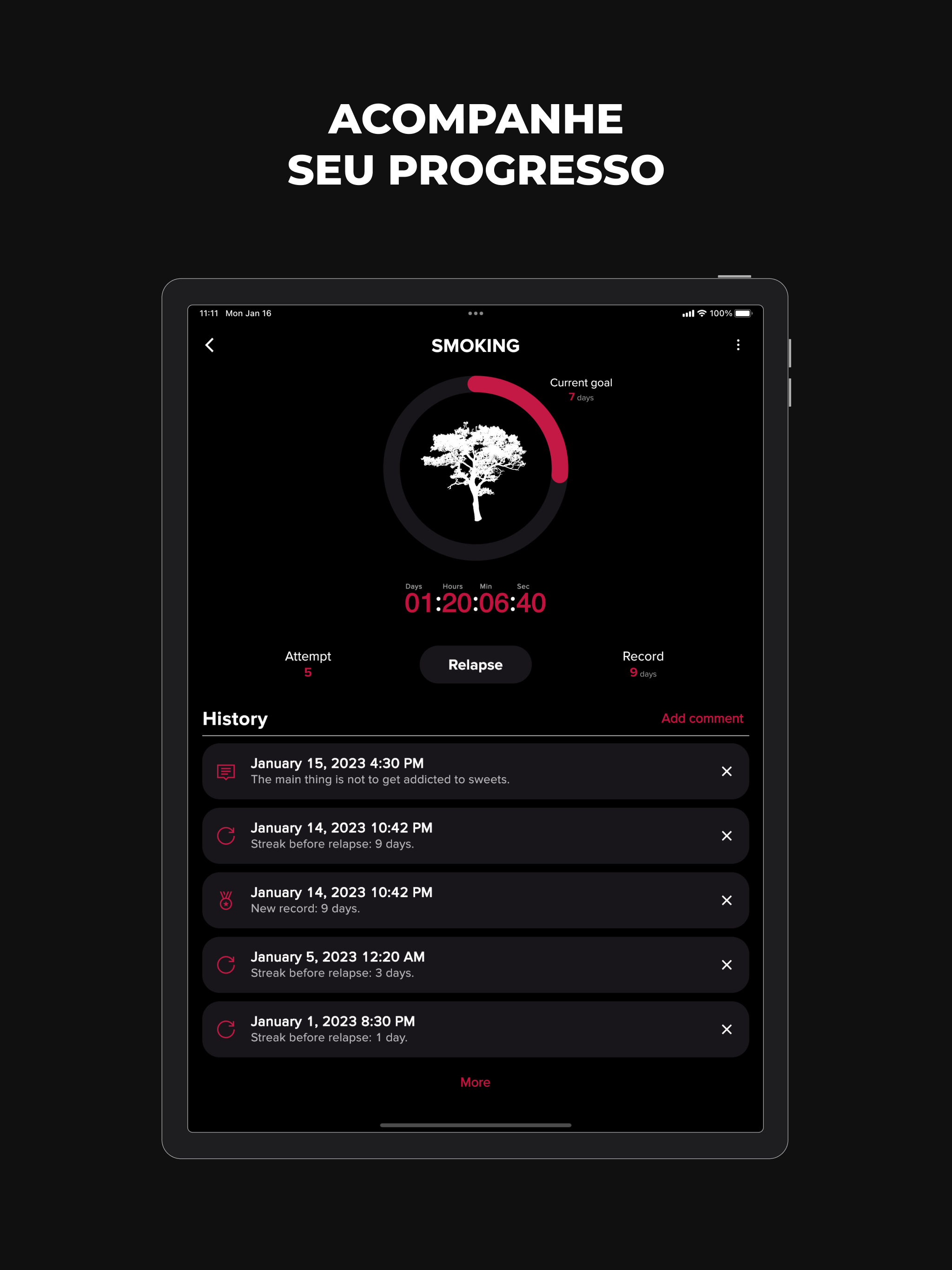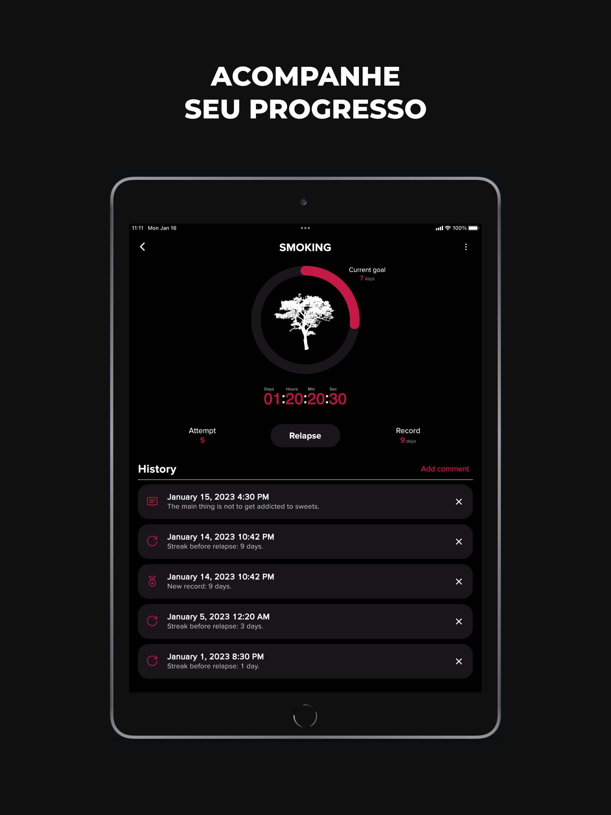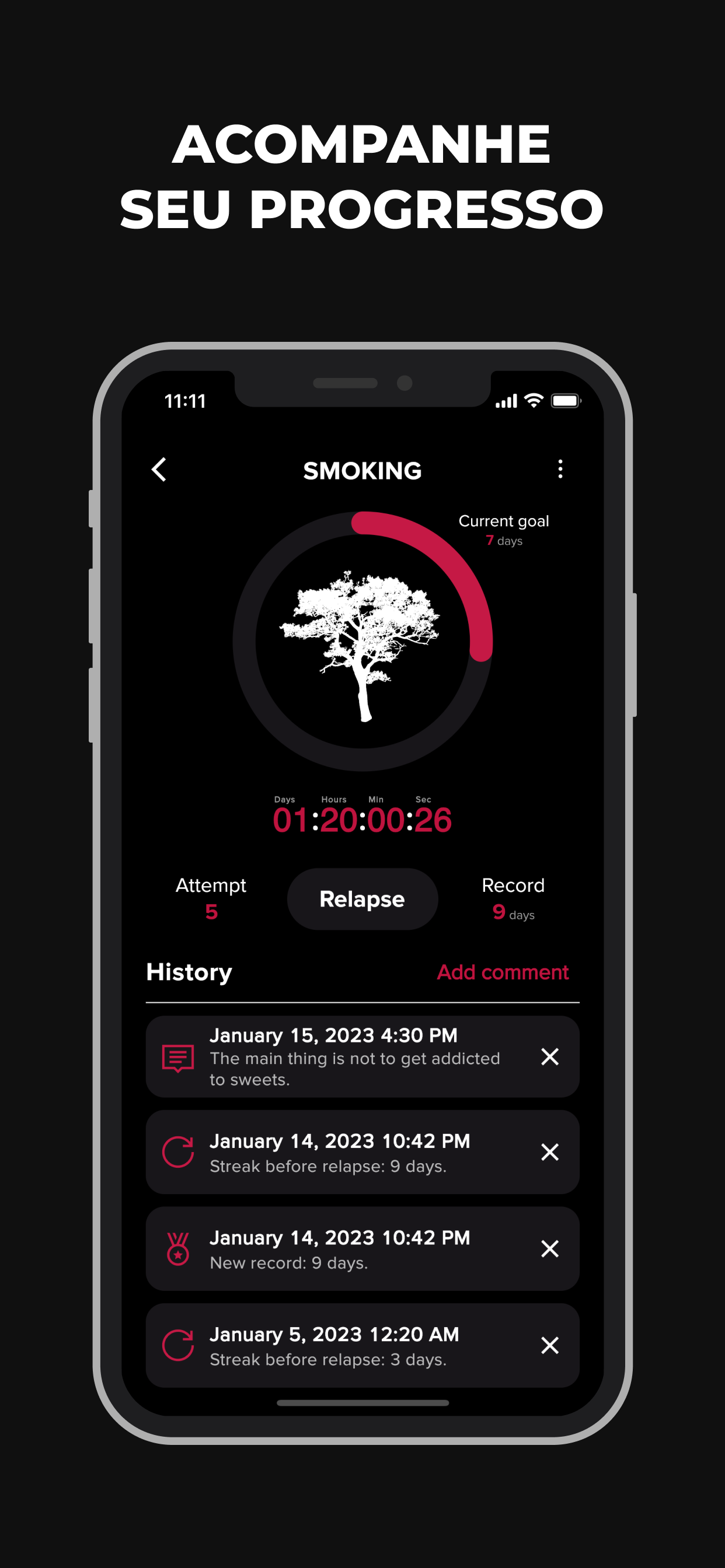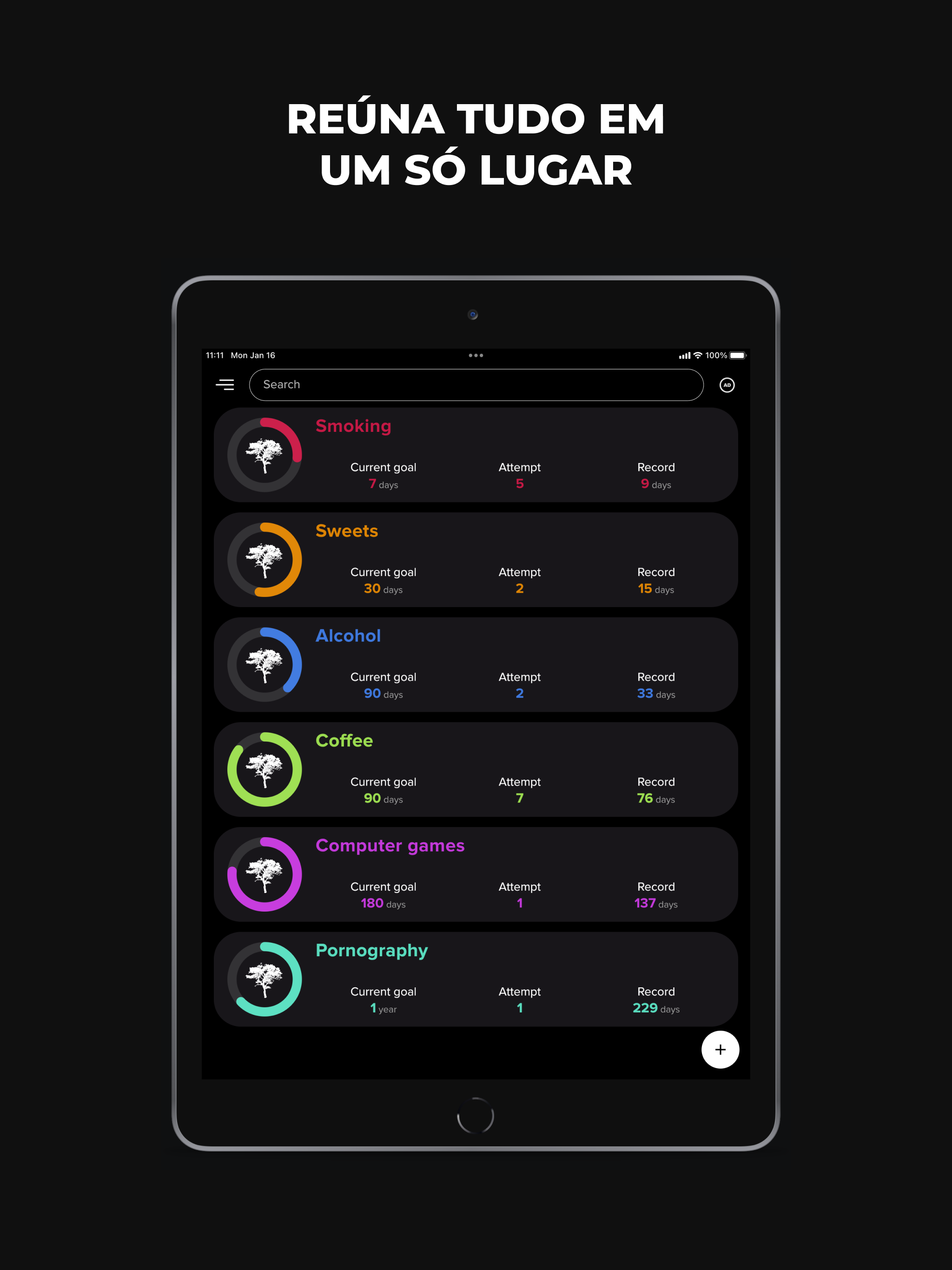 Largar Vícios é um aplicativo poderoso projetado para ajudá-lo a superar qualquer vício, seja ele álcool, nicotina, cafeína, jogo de azar ou qualquer outro vício. Largar Vícios não é apenas um aplicativo, é seu parceiro de confiança que o acompanha em sua jornada de autodesenvolvimento. Este rastreador de hábitos dá a você uma vantagem ao proporcionar a capacidade de manter um histórico detalhado de seu progresso. Adicione notas sobre seus pensamentos, sentimentos, eventos notáveis e até recaídas. Ao examinar seus registros pessoais e entender seus padrões, você está melhor equipado para controlar seus comportamentos viciantes. Além disso, nosso aplicativo é o seu motivador e guia, definindo constantemente novos objetivos alcançáveis para mantê-lo no caminho certo. É hora de retomar o controle de sua vida e dar um basta nos comportamentos viciantes que têm lhe impedido. Principais recursos: - Um companheiro diário perfeito para uso diário. - Adequado para todos os tipos de vícios e maus hábitos, como fumar, beber, pornografia, jogar. - Capacidade de rastrear um número ilimitado de hábitos. - Cronômetro regressivo que exibe o tempo (número de dias, horas, minutos e segundos) decorrido sem se envolver em um mau hábito. - Histórico detalhado para estatísticas e análise aprofundada e melhor compreensão de seus padrões de comportamento. - Recurso de anotações para capturar seus sentimentos e pensamentos. - Exibição do número de tentativas para mostrar seu progresso. - Registros pessoais que o motivam a superar seus limites. - Metas constantemente atualizadas para melhoria contínua. - Personalização de cada hábito para se adequar às suas necessidades únicas. - Conteúdo útil que ajuda em sua jornada de abandonar maus hábitos. - Alternando entre o tema claro e escuro de acordo com sua preferência. - Suporte multilíngue, tornando-o acessível a usuários em todo o mundo. - Um design minimalista que garante uma navegação amigável ao usuário. - Totalmente gratuito, porque acreditamos em acessibilidade e igualdade em autodesenvolvimento. Entre na sua nova vida e diga adeus aos maus hábitos e vícios. Com Largar Vícios, uma vida mais saudável e feliz está a apenas um aplicativo de distância. Desejamos-lhe boa sorte!