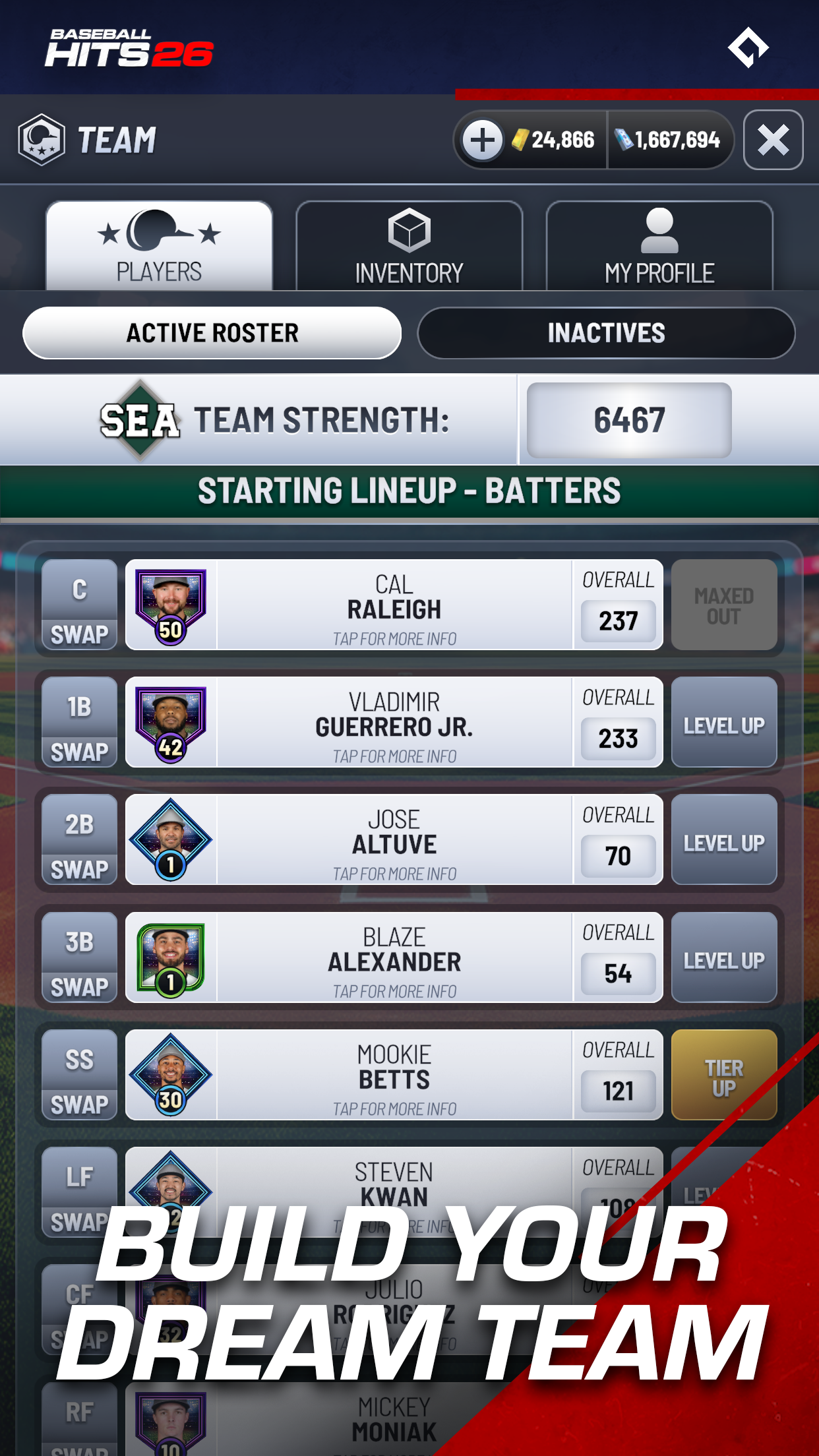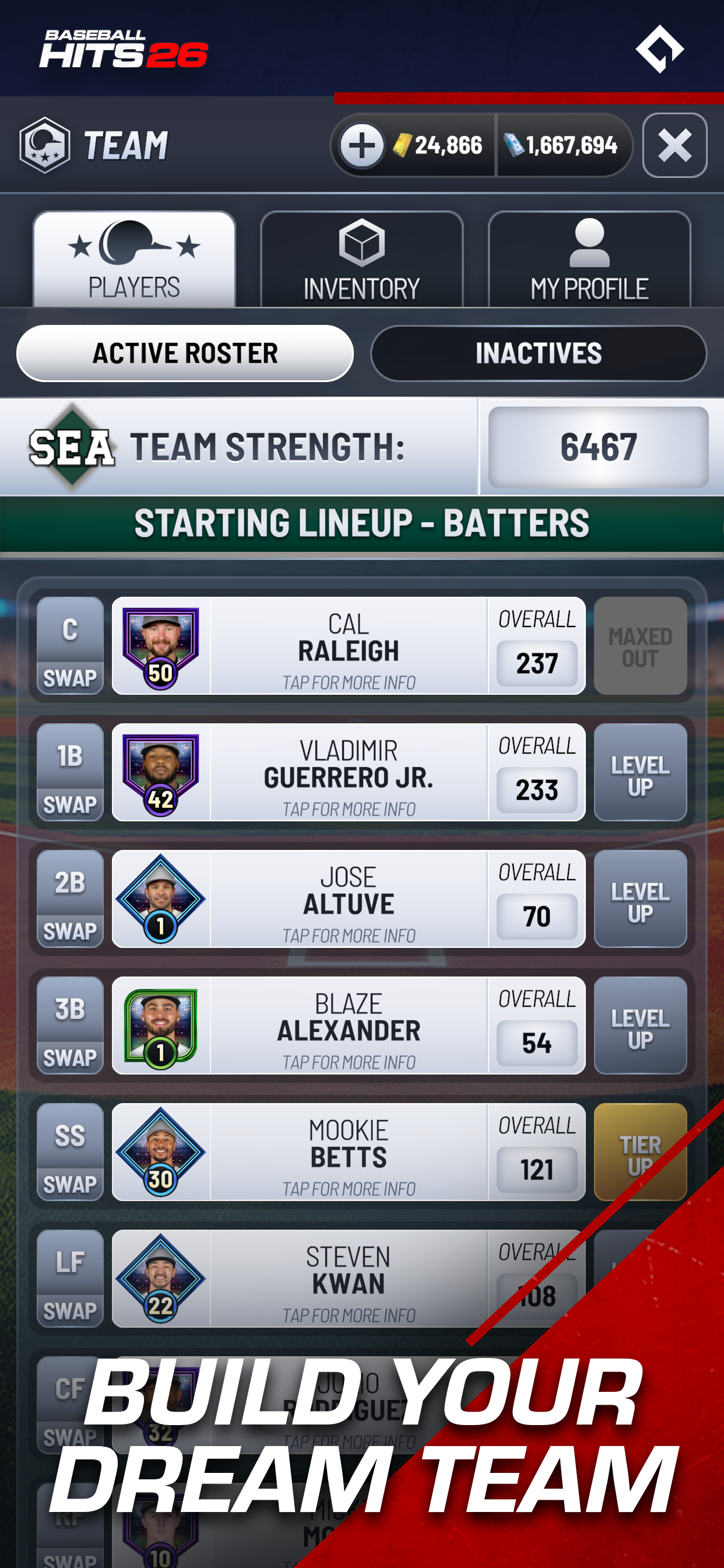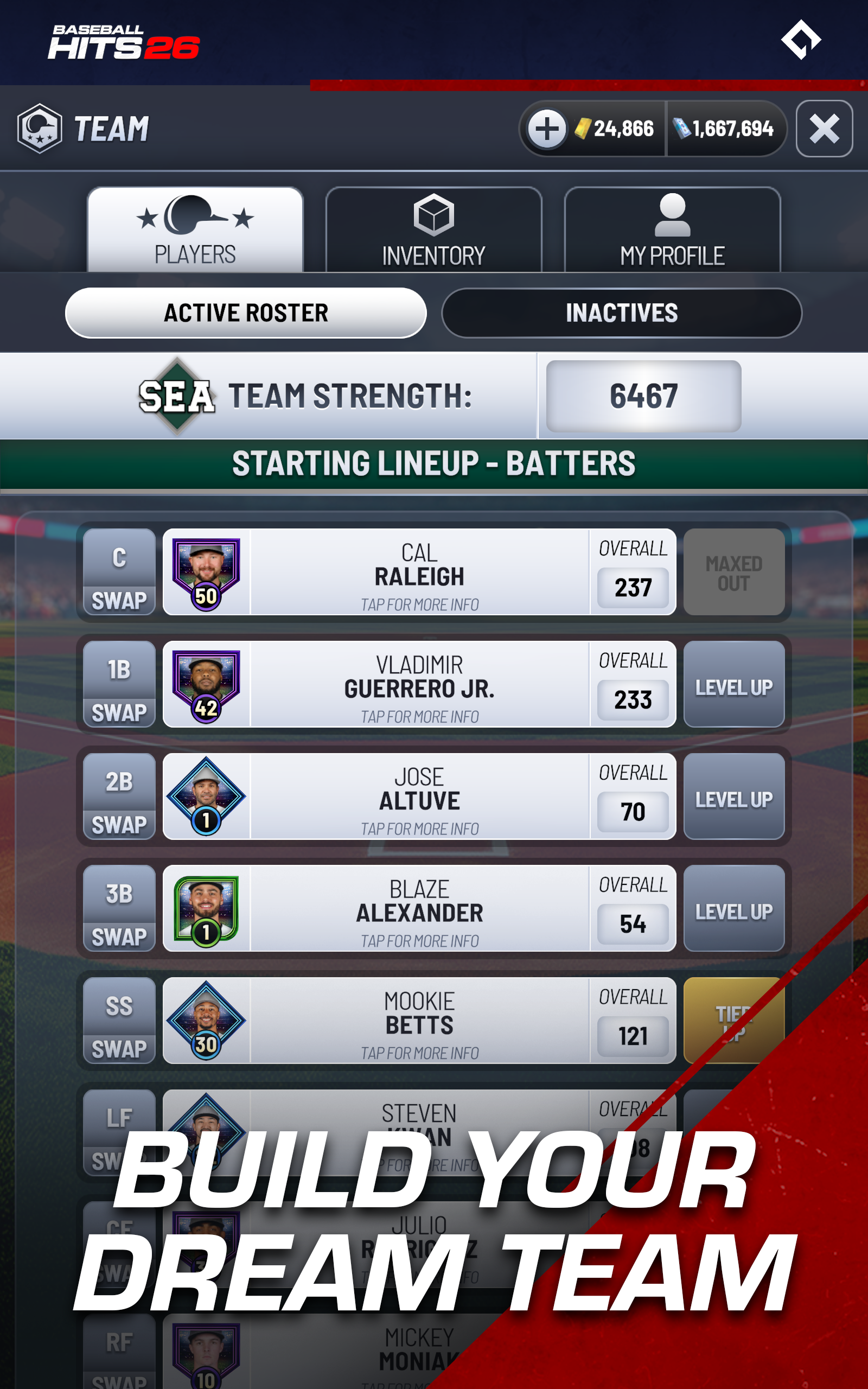 Jogo oficialmente licenciado pela MLB Players, Inc. JOGUE COM OS PROFISSIONAIS. A QUALQUER HORA, EM QUALQUER LUGAR Entre em campo e experimente a emoção do beisebol de verdade, oficialmente licenciado pela MLB Players, Inc. Colecione e jogue com as maiores estrelas da atualidade em um jogo para celular fácil de aprender e extremamente divertido, criado especialmente para os fãs de beisebol. FÁCIL DE JOGAR. DIFÍCIL DE PARAR Toque para rebater, acerte o tempo e mande a bola para longe. Cada arremesso, rebatida e home run parece autêntico graças à animação realista de captura de movimento, física realista do beisebol e estatísticas baseadas em todos os jogadores da vida real. Seja buscando uma rebatida decisiva ou mandando bolas para fora do campo no Modo Home Run, cada rebatida proporciona a adrenalina da liga principal. MONTE SEU TIME DOS SONHOS Recrute e aprimore profissionais da temporada de 2026! De Cal Raleigh, um receptor versátil que rebate com ambas as mãos, a estrelas completas como Mookie Betts e Juan Soto, passando pelo veterano decisivo Freddie Freeman e pelo arremessador promissor Trey Yesavage. Combine lendas atuais e jovens talentos para criar o elenco perfeito, aprimore-os e suba nos níveis competitivos para provar que sua equipe merece estar entre a elite. COMPITA E VENÇA JUNTOS Junte-se a um Clube para se conectar com outros fãs, conversar e competir em eventos e torneios ao vivo. Trabalhem em equipe para ganhar recompensas, subir nos placares de líderes e mostrar quem manda no diamante. Cada vitória conta e os clubes vencem mais juntos. SESSÕES CURTAS. GRANDES MOMENTOS Projetado para dispositivos móveis, Baseball Hits 26 se encaixa perfeitamente no seu dia. Jogue uma entrada rápida no intervalo ou uma série completa de playoffs à noite! O ritmo é acelerado, a ação é realista e cada rebatida importa. COMPETIÇÕES RÁPIDAS. GRANDES MOMENTOS Projetado para dispositivos móveis, Baseball Hits 26 se encaixa perfeitamente no seu dia. Jogue uma entrada rápida no intervalo ou uma série completa de playoffs à noite! O ritmo é acelerado, a ação é realista e cada rebatida importa. COMPETIÇÕESSUPERE OS RANKINGS. CONSTRUA SEU LEGADO. Ascenda de novato a lenda enquanto avança pelos níveis, desbloqueia jogadores poderosos e busca estrelas de edição especial que celebram os melhores do jogo. Ganhe caixas de recompensas, colete moedas e continue melhorando temporada após temporada. UM MUNDO DE BASEBOL VIVO Com eventos ao vivo, lançamentos de jogadores e conteúdo novo o ano todo, Baseball Hits 26 é mais do que um jogo, é o seu lar para o beisebol autêntico no celular. Cada atualização traz novos desafios, novos heróis e novos motivos para jogar. PRINCIPAIS RECURSOS • Licenciado oficialmente pela MLB Players, Inc. – jogadores reais, estatísticas reais, imagens reais dos jogadores • Jogabilidade simples com um toque para rebater • Física autêntica do beisebol e animações com captura de movimento • Montagem de elenco e progressão de jogadores detalhadas • Clubes, placares de líderes e eventos competitivos ao vivo • Gratuito para jogar com compras opcionais no aplicativo Baseball Hits 26 é fácil de jogar, divertido de dominar e feito para fãs de beisebol. Pegue seu taco, junte-se a um clube e tente alcançar a grandeza no beisebol AGORA! ENTRE NO CLUBE! Conheça outros jogadores, troque dicas e comemore grandes vitórias juntos no nosso Discord oficial do Baseball Hits, seu clube para notícias, eventos e destaques dos fãs. Adoraríamos receber seu feedback enquanto continuamos a desenvolver a experiência de beisebol mais divertida e autêntica para dispositivos móveis. Produto oficialmente licenciado da MLB Players, Inc. As marcas registradas, obras protegidas por direitos autorais e outros direitos de propriedade intelectual da MLBPA são de propriedade e/ou detidos pela MLBPA e não podem ser usados sem o consentimento por escrito da MLBPA ou da MLB Players, Inc. Visite MLBPLAYERS.com, a escolha dos jogadores na web.