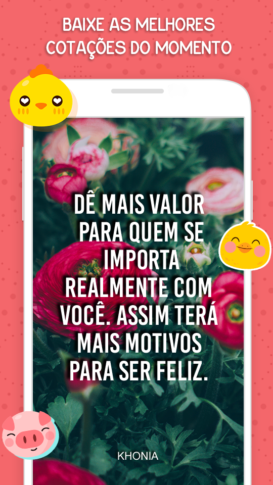 Por qué você prefere as frases lindas?Porque é uma aplicação completa e única que se concentra no fornecimento de frases do dia-a-dia da melhor qualidade e design. Além de encontrar diferentes coleções das melhores frases entre elas: frases bonitas para whatsapp, frases e status e frases bonitas de amor. Desta forma, os planos escolhem as mensagens mais apropriadas para cada momento ou humor.