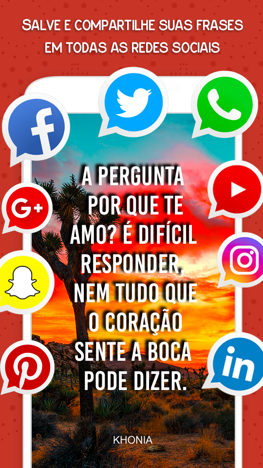 Compartilhe-os a qualquer momento:COMPARTILHE todas as nossas frases bonitas de amor com quem você mais deseja, expressando tudo o que sente ou o que sente com seus amigos, familiares, casal ou casal através do seu telefone em todas as redes sociais.