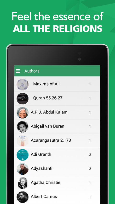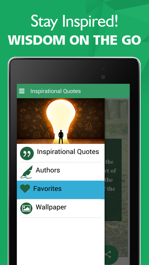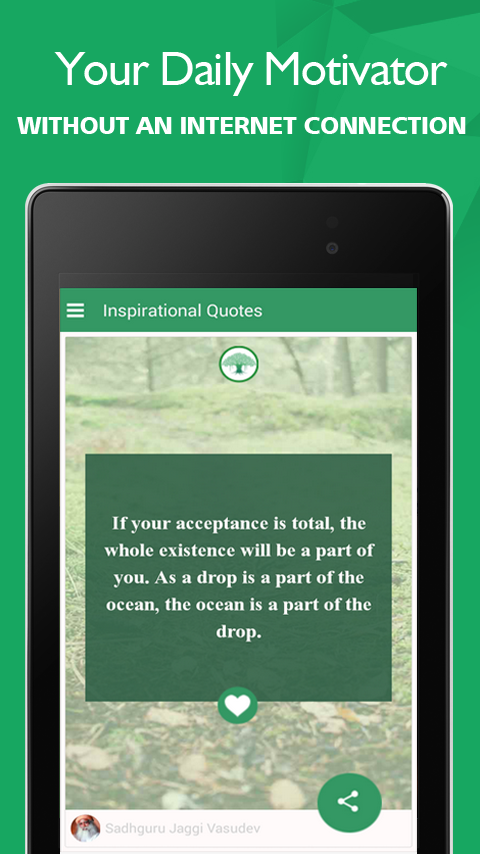 o Se é a longa viagem de ônibus ou rosnando tráfego em seu caminho para o trabalho, você pode manter-se atualizado, lendo estas citações livres em movimento. o que é mais: O aplicativo é acessível, mesmo sem uma conexão com a Internet. Tudo que você precisa fazer é baixar o aplicativo e acessar algumas citações inspiradoras melhor desligada ... a qualquer hora, em qualquer lugar. o Você pode navegar através das citações, selecionando a sua personalidade favorita o Gostou uma citação? Gostariam de lê-lo uma e outra vez? Nenhum problema, você pode adicioná-lo à sua lista de favoritos e acessá-lo a qualquer hora que você quiser! o As imagens serenos por trás das citações inspiradoras criar um efeito calmante sobre a mente - e você também pode defini-las como papel de parede Mobile! Agora, como isso é legal? o Você começa a ler um novo pensamento a cada dia para ajudá-lo a refletir sobre temas como amor, fé, compaixão, motivação e muito mais ... o Espalhe a sabedoria, compartilhando estas citações inspiradas com seus amigos via Facebook, WhatsApp e mensagens de texto. O que há de novo Um olhar para a internet e você pode ser inundado com número infinito de citações motivacionais, mas nenhum deles realmente ter um impacto em seu coração. Estas citações positivas que este aplicativo traz para você vem desde os maters distintos que alcançaram níveis espirituais superiores. Cada um de nós temos nossas próprias batalhas únicas para lidar com! Às vezes ganhamos, às vezes perdemos, mas às vezes nós apenas parar ... e começar a questionar se a vida vale a pena todo o tumulto, isto é, quando começamos a procurar alguma sabedoria profunda que pode nos mostrar a luz. Nesta hora de necessidade, este aplicativo traz citações motivacionais que podem trazer de volta zing em seu ser. Estas citações positivas fornecer-lhe alimento para o pensamento e eleva o seu estado de espírito. Este é um app citações inspiradas extremamente simples, mas muito valiosa que lhe promete milhares de citações inspiradores. Com estas melhores citações inspiradas, você não só pode manter-se em alto astral, mas também compreender o significado mais profundo da vida. Com Falando Pensamentos app da Árvore, você pode ler diariamente, citações livres direita na parte da manhã e que seria suficiente para estimulá-lo durante todo o dia. Portanto, se quiser ficar inspirado, baixe o melhor aplicativo de citações inspiradoras e abrir a porta a positividade em sua vida! Aqui está um vislumbre do mundo de numerosas citações inspiradas: O que quer que a mente do homem pode conceber e acreditar, pode conseguir.