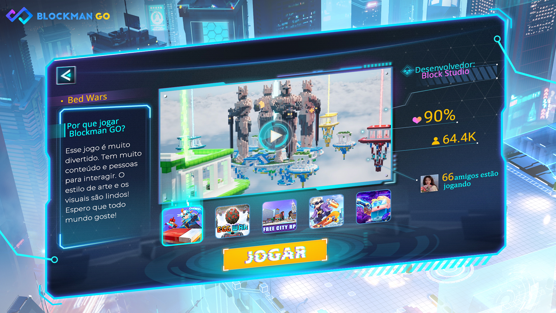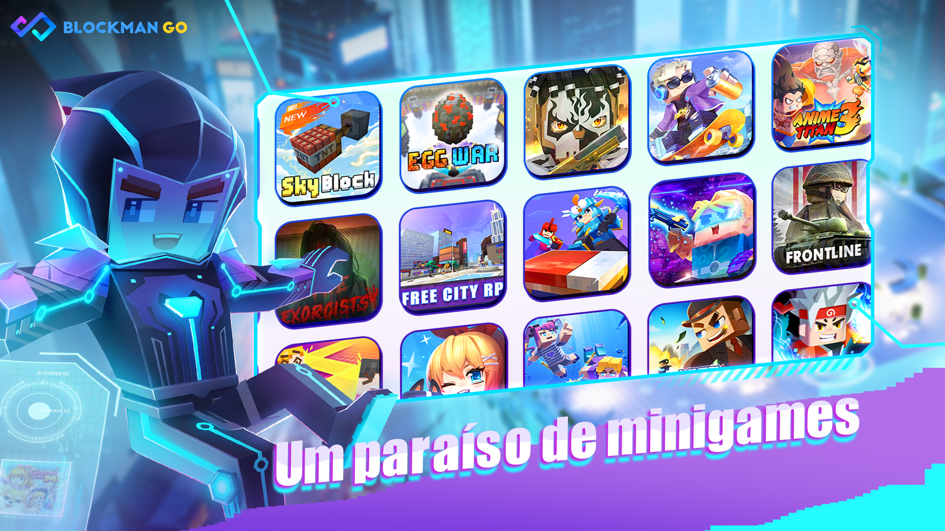 Prepare-se para conhecer o primeiro jogo sandbox da Garena - o Garena Blockman GO! Garena Blockman GO é o melhor sandbox gratuito para jogar, criar e compartilhar experiências com amigos. Já tem uma conta Blockman GO? Faça login com a conta Blockman GO e jogue agora! *Paraíso dos minigames No Garena Blockman GO, há sempre algo novo e legal para descobrir todos os dias! Junte-se à aventura com nossos inúmeros minigames de vários gêneros! [Party Street] - Novo Colete graffitis pela cidade e coloque-os nas paredes que quiser! Experimente o estilo de vida urbano em Party Street e entre nessa festa com os outros jogadores descolados! [Os Exorcistas] - Novo Um jogo de sobrevivência e traição. Sendo um dos 4 exorcistas, você deve realizar um exorcismo em uma escola abandonada. Mas cuidado! Há um impostor demoníaco infiltrado entre vocês... Ache pistas para encontrar o impostor e termine o ritual de exorcismo completando várias missões. Enquanto isso, o impostor deve esconder sua verdadeira identidade, enganar os exorcistas com pistas incorretas e invocar o diabo para eliminar todos os jogadores. [Frontline] - Novo Novo jogo de tiro multijogador (30 vs 30) de campo de batalha! Você assumirá o dever de um soldado e participará de uma simulação de batalha. Para vencer o jogo, tente atirar, dirigir tanques e veículos blindados, comandar seus companheiros para ocupar as áreas centrais e cooperar com outros jogadores para garantir a vitória final da equipe! [Bed Wars] - Popular Bed Wars é um jogo PVP de equipe muito popular com um grande número de jogadores em todo o mundo! Seu objetivo é defender a cama na sua própria base enquanto usa todas as ferramentas à sua disposição para destruir as camas dos oponentes e sair vitorioso! [Free City RP] - Popular Já se imaginou sendo um vigilante implacável como Bruce Wayne? Já pensou em causar puro caos e viver só pela emoção? No Free City RP, você pode fazer tudo isso e muito mais! *Experiência de jogo aprimorada Nós preparamos uma versão aprimorada do tutorial com uma apresentação melhor e mais fácil de entender. Também otimizamos o sistema de idiomas com fontes renovadas! *Jogue com amigos - não importa a hora ou lugar! Bed Wars, Egg Wars, Sky Block e outros são muito mais legais com amigos. Com o jogo otimizado para celular, agora você pode se juntar a milhões de outros jogadores - a qualquer hora, em qualquer lugar. *Qual é o seu estilo? Mostre seu estilo único para todo mundo! Personalize seu Avatar com roupas e acessórios criativos! Com nosso estoque atualizado de itens, o céu é o limite. ATENÇÃO: Garena Blockman GO é totalmente gratuito para jogar, mas é possível fazer compras no aplicativo. Você pode desabilitar compras dentro de aplicativos nas configurações do seu dispositivo. Informações da assinatura VIP auto-renovável: VIP+: 4,99 USD/mês incluindo 360 Gcubes e outros benefícios; MVP: 9,99 USD/mês incluindo 800 Gcubes e outros benefícios; MVP+: 24,99 USD/mês incluindo 2.000 Gcubes e outros benefícios; As assinaturas VIP+/MVP/MVP+ serão renovadas automaticamente no final de cada período de assinatura até que você as cancele. Você será cobrado pelo mesmo nível de assinatura, a menos que troque de nível. Não enviaremos notificações sobre renovações de assinatura, portanto, recomendamos que você monitore e preste atenção nas suas assinaturas. É possível cancelar a assinatura VIP+/MVP/MVP+ a qualquer momento nas configurações da conta. Após o cancelamento, a assinatura VIP+/MVP/MVP+ não será renovada e expirará no último dia do período de assinatura. TERMOS DE SERVIÇO: https://terms.blockmanmobile.com/en/tos.html POLÍTICA DE PRIVACIDADE: https://terms.blockmanmobile.com/en/pp.html CONTATO: https://www.facebook.com/blockmangoBR BLOCKMAN GO SITE OFICIAL: https://blockmango.garena.com/