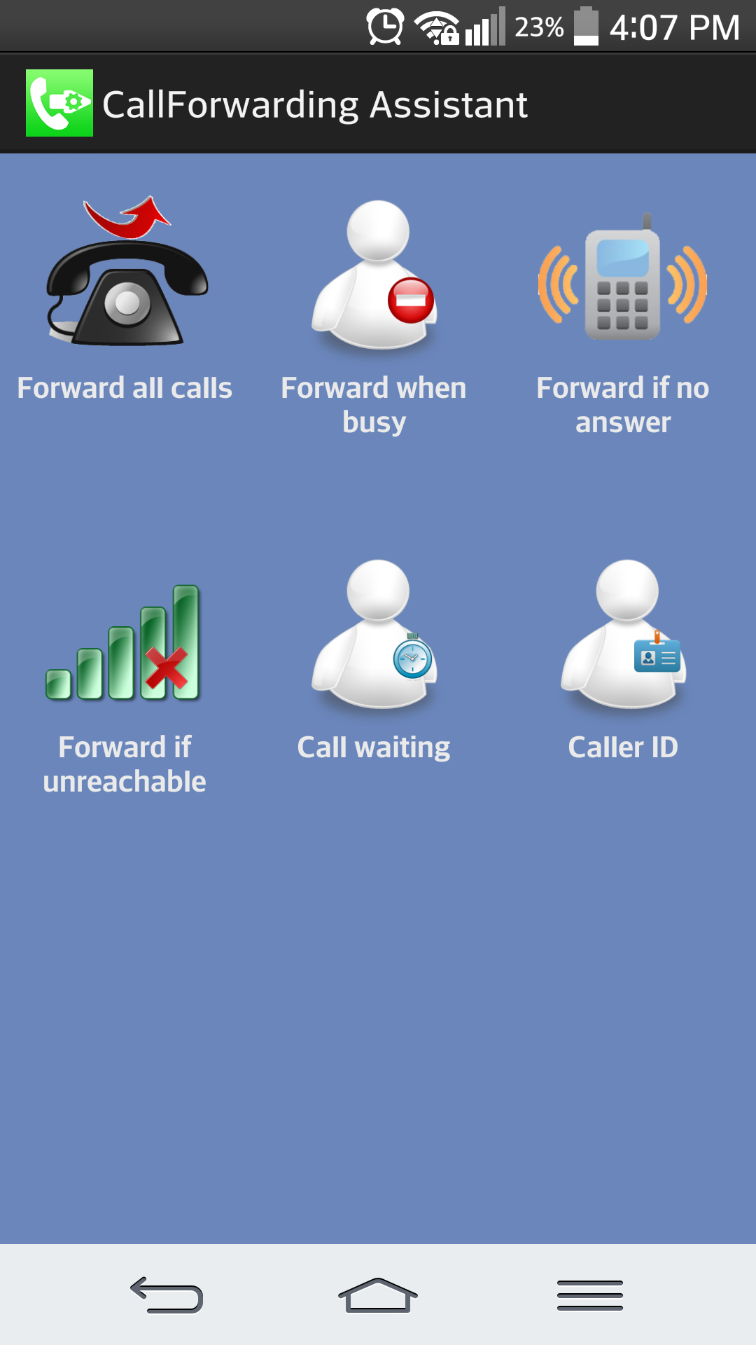 CallForwarding Assistant helps you manage your call forwarding activities. Not all mobile phone manufacturers provide full function of Call Forwarding service in the mobile phone, CallForwarding Assistant may able to manage the call farwarding settings such as All Calls, Forward when busy, Forward if no answer, Forward if unreachable, Call Waiting On/Off, Caller ID etc.