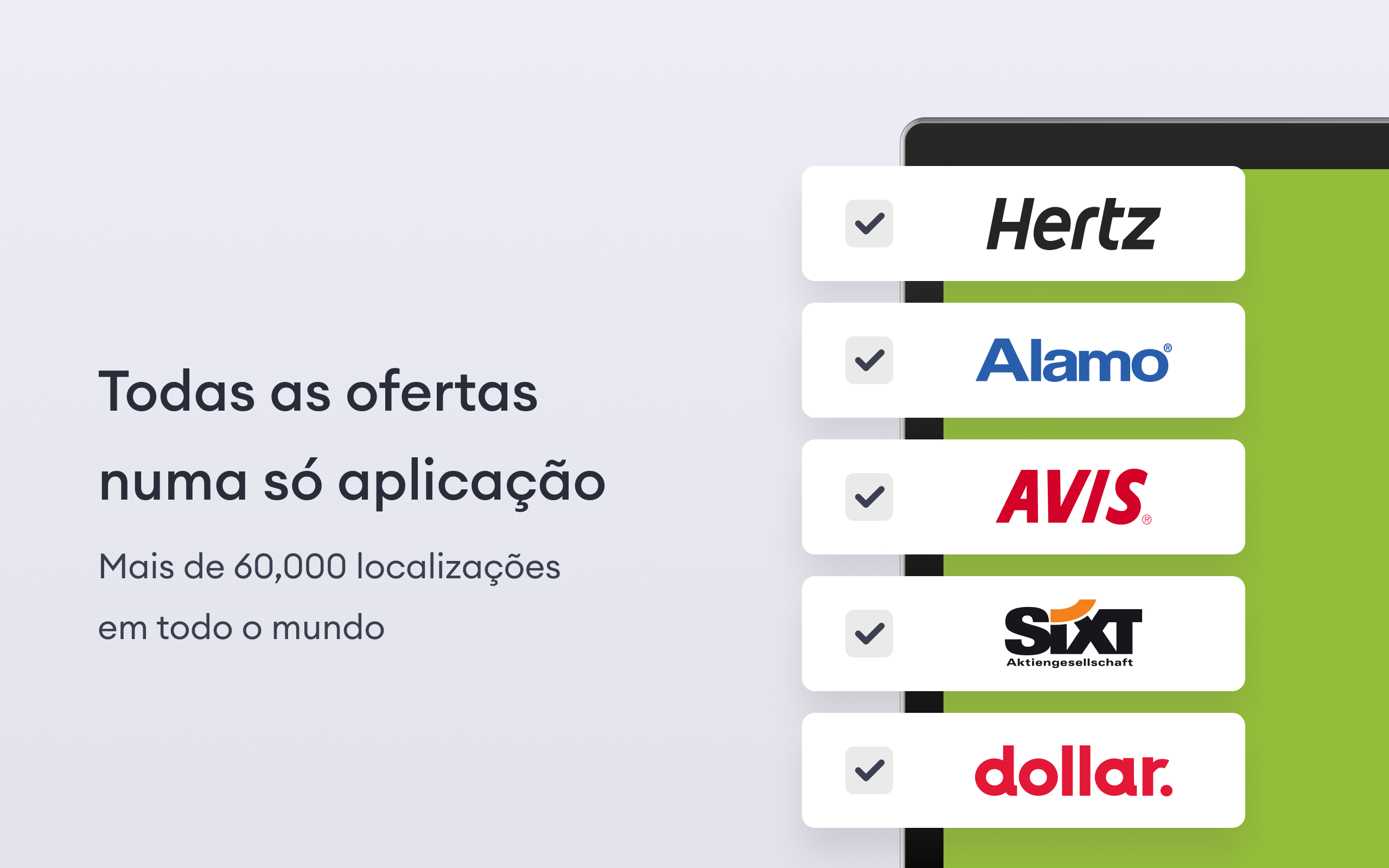 Descontos exclusivos, promoções conjuntas e ofertas especiais de empresas mundialmente conhecidas: Avis, Sixt, Hertz, Goldcar, Enterprise, Thrifty, Budget Car Hire, Alamo, Payless, Dollar rent-a-car, Advantage, Europcar, Ace, Fox Car Rent, Buchbinder, Global Rent, Keddy, InterRent, alugar carro, Centauro, JoyRent, Maggiore, Noleggiare, Rentacar, Rhodium, Sicily By Car, WinRent, Firefly car rental discounter, Nu Car Rental, Ez Car Rental, Economy Car Rental, International Car Rental.