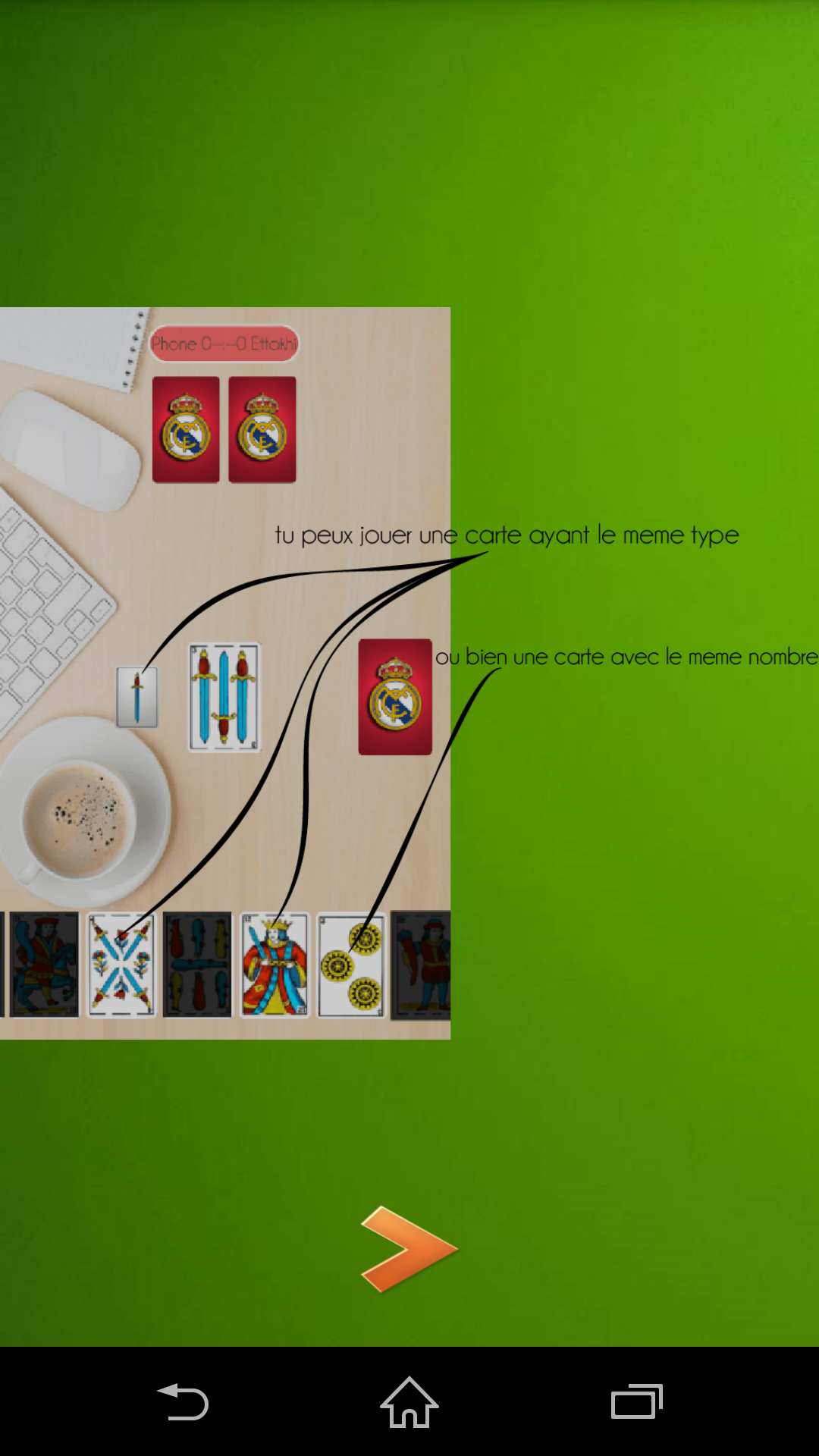 -pour jouer vous devez choisir une carte qui a le même numéro du carte au centre ou bien une carte qui a le même type, et si vous n'avez aucune carte à jouer vous devez tirer une cartes dans les cartes à droite .