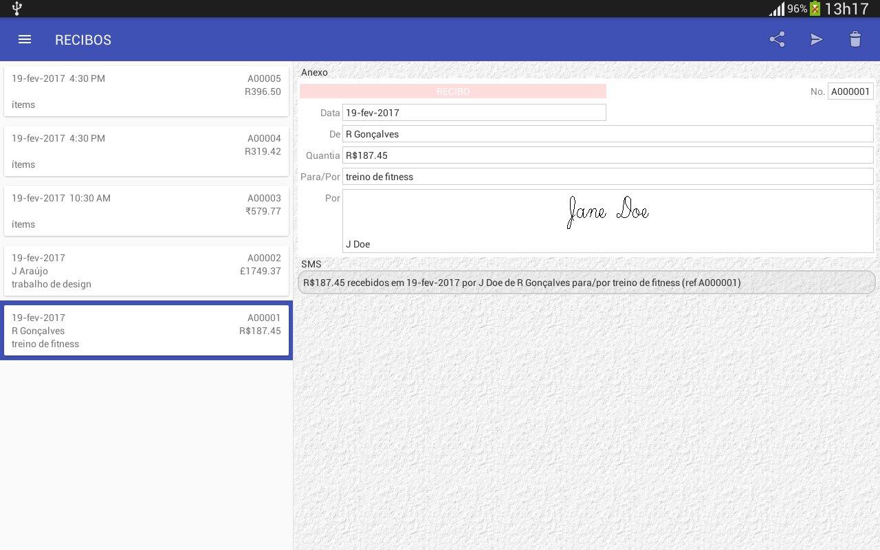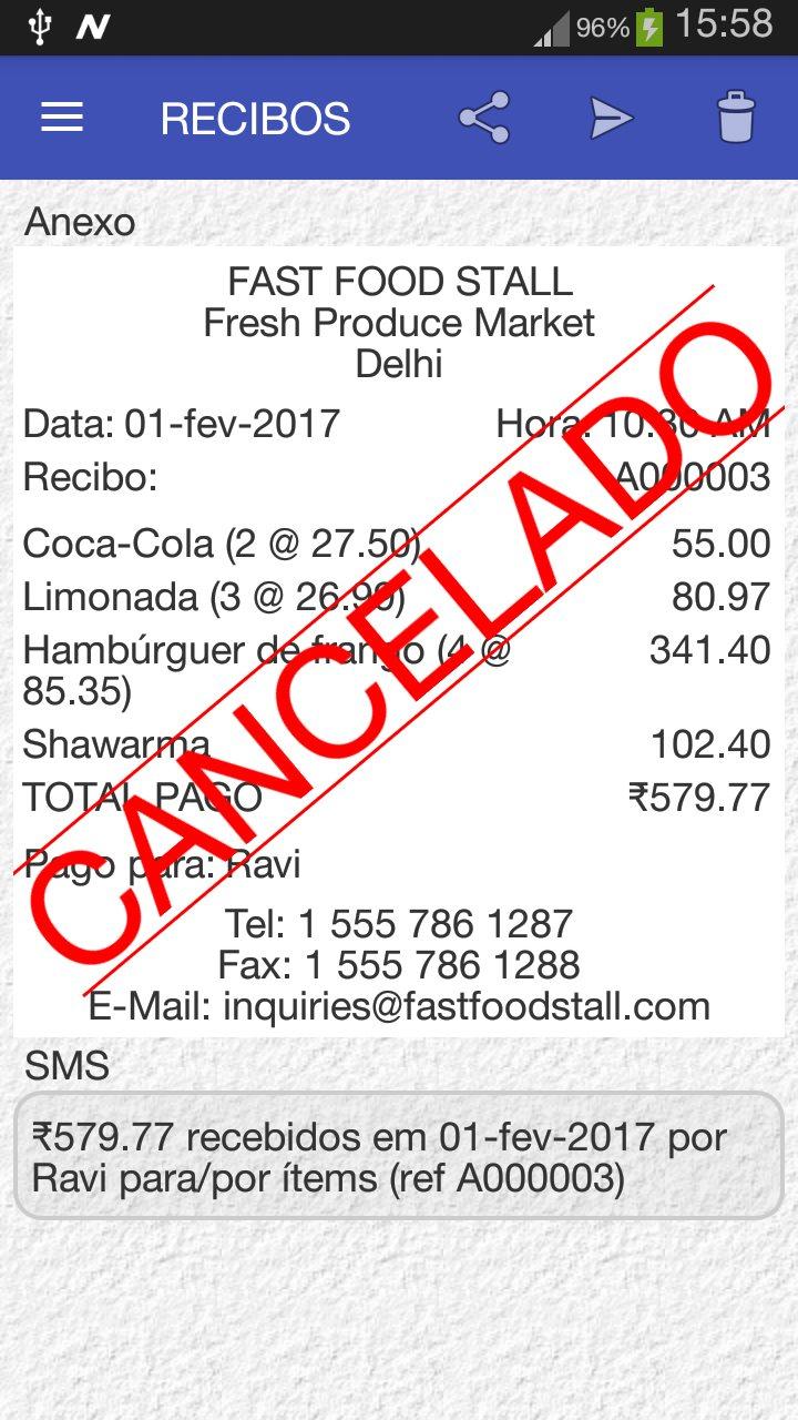CRIE, GUARDE E ENVIE RECIBOS DE PAGAMENTO Forneça um comprovante para quem pagou em dinheiro ■ Substitui o talão de recibos ■ Todos os recibos ficam armazenados em seu aparelho ■ Funciona em Celulares e Tablets ■ Os recibos são numerados automaticamente ■ Envie recibos diretamente pelo aplicativo ■ O valor por extenso é gerado a partir dos números inseridos (veja idiomas suportados) São geradas duas versões para cada recibo: ■ Anexo (recibo gráfico) • para ser enviado como anexo - por e-mail - por um aplicativo de mensagens • pode ser enviado como um MMS por meio de SMS • é possível assinar o recibo usando o dedo • envie o recibo por aplicativos de compartilhamento ■ Mensagem SMS (140 caracteres) • otimizado para uso em qualquer aplicativo de SMS • em mensagens muito longas, o valor por extenso será excluído ■ Os recibos podem ser: (Um clique longo na lista de recibos OU pelo botão 'deletar' na visualização de recibos) • CANCELADOS - marcado como cancelado • RESTAURADO - desmarcado como cancelado • DELETADO - totalmente removido dos registros EXPORTE: ■ Exporte os recibos para o formato .CSV ■ Envie por aplicativo de compartilhamento, mensagem, etc. ■ Arquivos exportados podem ser abertos com aplicativo de planilha FILTRO: Permite separar os recibos por data, 'recebidos de' e 'recebidos por' IDIOMAS SUPORTADOS ■ Inglês ■ Português Brasileiro (Valor por extensor não é suportado) ■ Latino Espanhol (Valor por extensor não é suportado) CONFIGURAÇÃO: ■ Selecione o estilo do recibo (ÍTEM MÚLTIPLO / ORIGINAL / SIMPLES) ■ Inclua uma imagem como logotipo/timbre (a partir de imagem .png sem fundo) ■ Inclua um cabeçalho (com valor padrão opcional) ■ Inclua a hora em seus recibos ■ Escolha sua moeda corrente ou insira a que deseja usar ■ Utilize destinatário predefinido ou use desnatinários para cada recibo ■ Inclua sua assinatura nos recibos ■ Configure uma assinatura padrão ou assine os recibos individualmente ■ Mostre o valor 'ainda devido' nos recibos ■ Inclua um rodapé (com valor padrão opcional) ■ Inclua impostos nos recibos de ÍTEM MÚLTIPLO • SEM IMPOSTO - imposto a ser adicionado • COM IMPOSTO - imposto já incluso MOEDA CORRENTE: Para configurar a moeda deve-se digitar o símbolo que a identifica, bem como o singular e o plural dos termos para as unidades e subunidades Para facilitar, basta selecionar sua moeda corrente dentre as disponíveis na lista e depois digitar os valores desejados PROCURAR NA LISTA Ao salvar os recibos, as descrições digitadas em 'Recebidos de', 'Recebidos por' e na descrição do item são adicionadas à lista de termos pesquisáveis. Essa lista pode ser acessada pelo ícone de pesquisa que aparece na parte superior da tela quando o cursor está na área selecionada Por exemplo, suponha que você criou dois recibos, um com "Aluguel de Janeiro" e outro com "Aluguel de Fevereiro" na categoria "Recebido por" Então, quando salvar um terceiro recibo: - ao digitar "J" no campo "Recebido por" e clicou no ícone de pesquisa, logo verá "Aluguel de Janeiro" na lista e basta clicar para selecioná-lo. - da mesma forma, ao digitar "F", você verá "Aluguel de Fevereiro" - ao digitar "A" você verá ambos, bastando clicar no escolhido Ao clicar no ícone de busca, sem nada digitar, aparecem todas as possibilidades disponíveis. Pode-se então digitar na barra de buscas no topo da tela, que mostrará todos os itens contendo a palavra-chave. Use a 'cruz' para limpar o campo de buscas e use o 'triângulo' para aceitar tudo o que foi digitado no campo "Recebido por". Um clique longo em qualquer item da lista permite removê-lo de buscas futuras. COLABORADORES ■ Versão em Português por Roberto Luis De Mello. Obrigado! ■ Versão em Latino Espanhol inicial por Andrés Castillo/Castillo Consultores. Obrigado! SEM GARANTIAS Este aplicativo é distribuído na esperança de ser útil, porém SEM QUALQUER GARANTIA de qualquer natureza, para qualquer que seja o objetivo de seu uso.