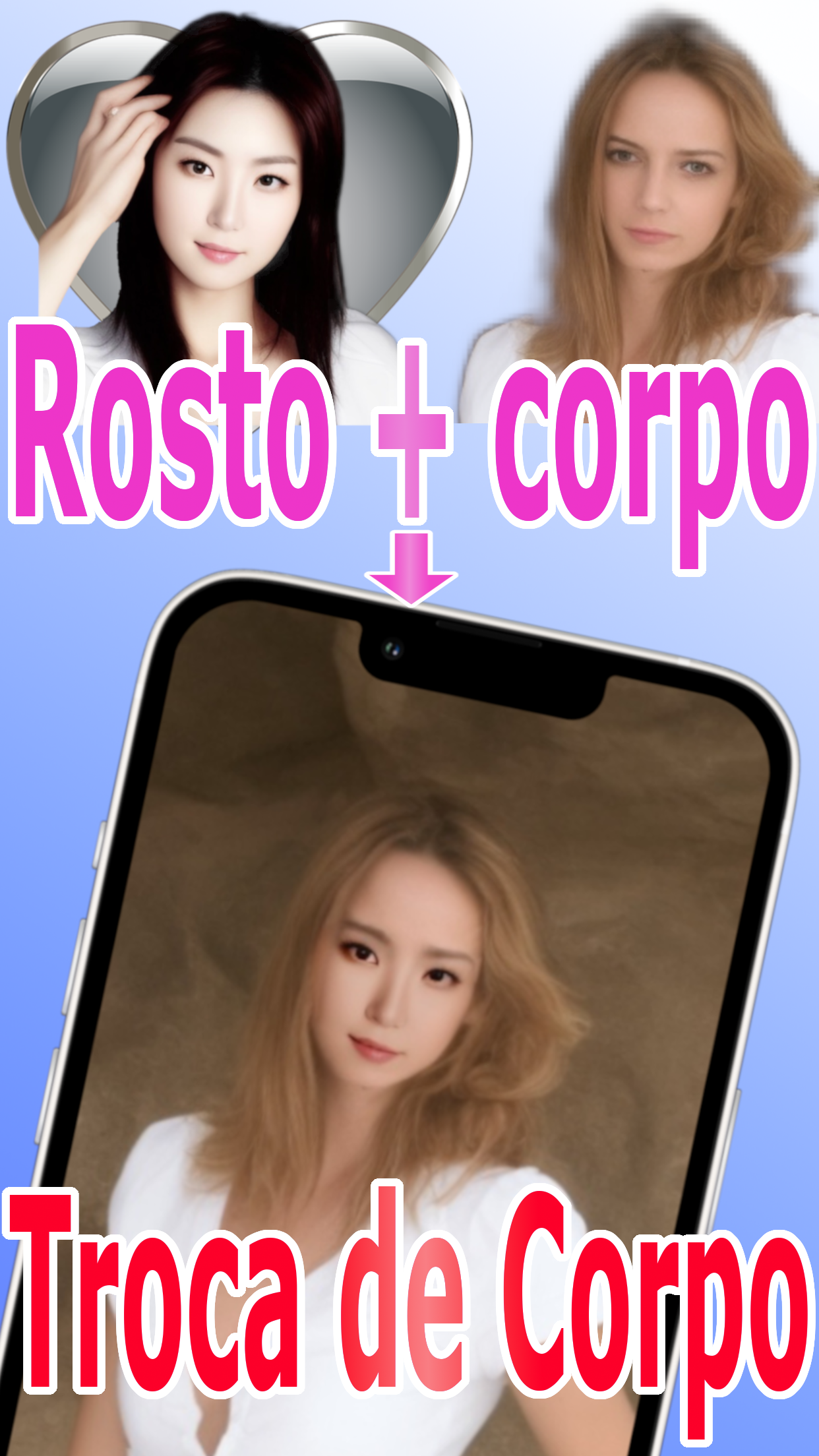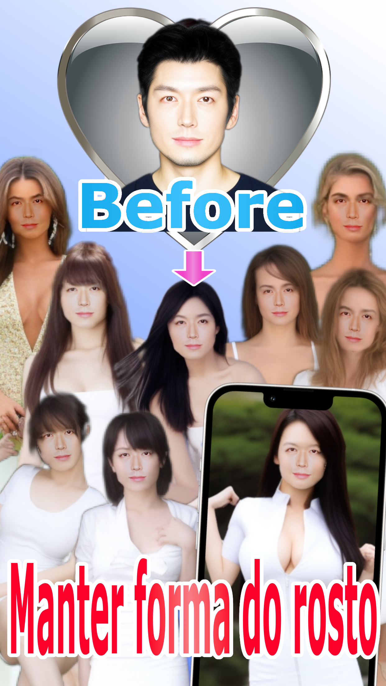 Esta é uma popular aplicação de troca de corpos para homens. Em vez de trocar os rostos, troca-se os corpos. É possível criar uma imagem composta a partir de duas imagens: uma de corpo e outra de rosto. Principalmente, são usadas fotos de mulheres. Se tiver a foto do rosto de alguém que gosta e uma foto de um corpo que goste, pode criar uma imagem composta trocando os corpos. É possível criar fotos compostas em que a pessoa usa roupa que normalmente não usaria ou em poses que normalmente não tomaria. Também é possível criar imagens falsas de nudez ao estilo deepFake, mas por favor, não as utilize com fins mal-intencionados. O que torna esta aplicação diferente de outras de troca de rostos? Depois de trocar os corpos, o contorno do rosto da pessoa na foto não muda. A partir de uma foto de uma pessoa com rosto comprido, é possível criar uma imagem composta com um rosto comprido. A partir de uma foto de uma criança com rosto redondo, é possível criar uma imagem composta com um rosto redondo que mantém a aparência infantil. Também é possível criar pequenos vídeos de animação. É possível criar uma animação desde a transformação anterior até a transformação posterior. Isso é popular para uso em redes sociais. Entre os homens, uma animação popular é a de uma pessoa pulando para cima e para baixo continuamente na foto. Também é possível criar vídeos de zoom in e zoom out. Isso é útil para quando desejar mostrar a imagem composta de corpo inteiro e a imagem composta de rosto de perto aos seus amigos. É possível criar fotos compostas para disfarces de travestis, fantasias de Halloween, cosplays e assim por diante, bem como criar fotos de crianças vestidas de policiais, bombeiros, jogadores de futebol e outros. O uso depende do desejo do usuário. Atualmente, há um grande número de usuários masculinos neste aplicativo, mas originalmente foi desenvolvido para mulheres. Em um momento, 90% dos usuários eram homens, mas agora a proporção de mulheres voltou para 25%. Por favor, use os vestidos de noiva e outros vestidos coloridos disponíveis antecipadamente para obter um efeito melhor nos disfarces. Este aplicativo pode ser encontrado com palavras-chave como Troca de rosto, Troca de corpo, Troca de imagem, Editor de corpo, Editor de rosto, Troca de aparência, Transformação corporal, Simulador de corpo, Troca de gênero, Troca de personagem e outras. Nosso aplicativo pode ser encontrado por palavras-chave como Troca de Rostos, Transformação Facial, Troca de Gênero, Troca de Rostos Divertidos, Troca de Faces Engraçadas, Troca de Expressões Faciais, Troca de Rostos de Celebridades, entre outras. Este aplicativo pode ser pesquisado usando palavras-chave como: Criador de colagem de ídolos Aplicativo de colagem de fotos de ídolos Editor de fotos de ídolos Aplicativo de edição de imagens de ídolos Colagem de fotos de ídolos para fãs de música pop Aplicativo de edição de fotos de celebridades. Além disso, este aplicativo pode ser encontrado ao pesquisar por palavras-chave como fabricante de avatares, criação de avatares, troca de avatares, colagem de ídolos, colagem de personagens de anime, colagem de atletas, DeepFake, etc. A partir daqui, explicaremos com mais detalhes.