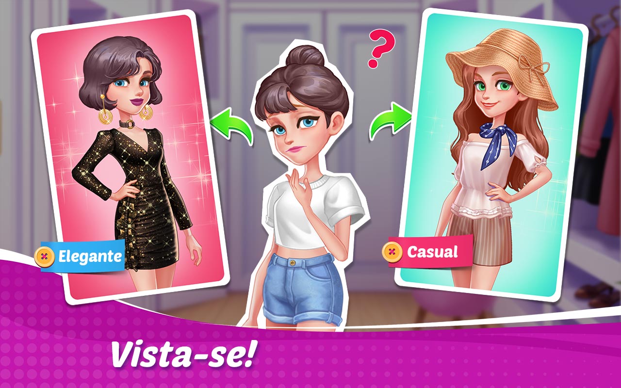 Vestir-seIncluem-se no jogo inúmeros estilos diferentes de roupas e maquiagem. Lindos vestidos maxi para estreias de cinema, suaves conjuntos para um encontro, roupa desportiva casual para jogar, uniformes legais para competições de cozinha. Você é o modelo em constante mudança e o chef mais estiloso!