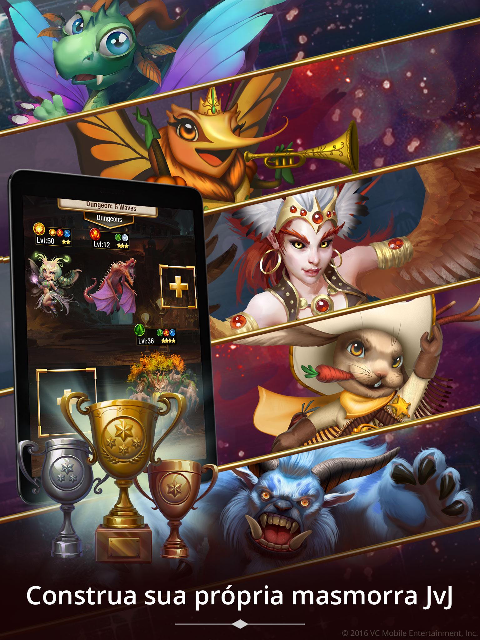 Intensidade, estratégia e RPG se misturam nessa aventura. Explore mapas e recolha criaturas no jogo revolucionário do criador de Heroes of Might & Magic. *Requer Android versão 4.1.2 ou mais recente, 1 GB + RAM e uma conexão com a internet. =RPG E ESTRATÉGIA SE MISTURAM EM UMA MISSÃO EM BUSCA DE CRIATURAS= • EXPLORE missões cheias de aventura e supere obstáculos para descobrir tesouros. • COLECIONE e aprimore mais de 500 criaturas fantásticas em busca de aventura • BATALHAS estratégicas e viciantes para o jogador que tem de dominar habilidades e magia contra criaturas • CONSTRUA sua própria masmorra e receba ótimos prêmios ao derrotar seus rivais em JvJ • GUILDAS oferecem prêmios exclusivos em JvJ e permitem diálogo entre os companheiros • EVENTOS DIÁRIOS incluem novas Missões, Prêmios, Desafios e Criaturas • EXCELENTE para jogadores de RPG, novos ou experientes; por minutos ou por horas; para diversão ou para competição Do lendário designer de jogos Jon Van Caneghem, criador da série de estratégia e RPG Heroes of Might & Magic, chega mais um sucesso em que cartas e RPGs colecionáveis se misturam à estratégia. Não importa se você está começando nos RPGs de estratégia e nos JCC de fantasia ou se busca mais estratégia e imersão nos jogos de RPG colecionáveis, Creature Quest é a resposta. Colecione e lute com habilidades mágicas e aprimore seu espectro de criaturas. Você começará com um time de 5 criaturas. Conforme for se envolvendo em batalhas de RPG por turnos com centenas de outras criaturas, você aumentará sua coleção e criará uma estratégia para seus times. Descubra tesouros, joias e fichas para evoluir suas criaturas e invocar mais algumas, novas e melhores. Aprimore e evolua suas criaturas para liberar o acesso a feitiços mais poderosos, movimentos mais potentes com a espada e habilidades mais incríveis. Converse com seus companheiros e receba prêmios JvJ exclusivos de sua guilda. As batalhas de RPG por turnos são dinâmicas, divertidas e estratégicas. Você pode simplesmente deslizar pela tela para combater rápida e facilmente, ou pode se movimentar de acordo com a estratégia planejada para cada batalha. Se você curte jogos de cartas de batalhas por turno, vai amar esse novo jogo de RPG colecionável. Você pode explorar novos reinos e descobrir prêmios em três modos de jogo: 1. MISSÕES: Você pode explorar novos reinos para descobrir tesouros enquanto luta contra uma variedade de dragões e outras criaturas fantásticas remanescentes de Heroes of Might & Magic. 2. ARENA VERTICAL: Você progride pelos níveis de dificuldade e prêmios crescentes, enquanto aumenta e aprimora sua coleção de criaturas. 3. DESAFIO DA MASMORRA: Você constrói sua própria masmorra com sua coleção de criaturas e atacas masmorras rivais enquanto progride nas posições de liderança no JVJ. E de acordo com a pontuação no ranking da sua guilda, você também pode receber prêmios JvJ. Com um exclusivo sistema de combo na batalha, você se verá criando e otimizando estrategicamente seus times para vencer nos embates, completas missões e dominar o JvJ. As criaturas podem usar Marcas de Combo elementais, como mana, para dar potencializar suas habilidades mágicas, ou podem dá-los a outra criatura de seu time, o que resulta em um multiplicador de ataque. Quando você dominar o sistema de combo, será invejado por todos os outros jogadores de Creature Quest! Baixe Creature Quest grátis hoje e faça parte do melhor jogo por turnos de RPG colecionável e JCC de estratégia. Sua jornada em busca de criaturas é marcada por aventuras. Vamos seguir com a Missão! **Embora o jogo Creature Quest seja gratuito para baixar e jogar, há compras com dinheiro real que podem ser realizadas no ambiente de jogo. Ao baixar o jogo Creature Quest, você concorda com a Política de Privacidade e com os Termos de Serviço disponíveis em nosso site.
