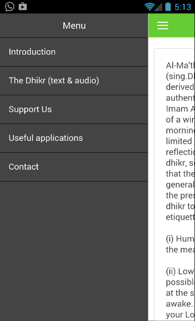 Alhamdulillah kami bisa menyediakan sebuah aplikasi dzikir terlengkap untuk diamalkan setiap hari baik pada waktu pagi maupun sore hari. Aplikasi ini akan membantu menyejukkan hati, memperkokoh tauhid, dan membuka pintu rizki. Melalui aplikasi Dzikir Al Ma'tsurat ini pengguna dapat menyimak bacaan dzikir yang disajikan dalam bentuk teks bahasa arab dan audio mp3. Pengguna juga dapat melihat terjemah dan refernsi kalimat dzikir yang disediakan developer pada setiap teks dzikir. Aplikasi ini juga dilengkapi dengan kumpulan video taujihat dari beberapa ulama yaitu: Almarhum K.H. Rahmat Abdullah (Kajian Kitab), K.H. DR. Ahzami Samiun Jazuli (Ceramah Umum dan Tematik), DR. Amir Faishol Fath (Ceramah Umum dan Tematik), dan Ust. Muhsinin Fauzi, Lc. MA. (Ceramah Bertemakan Keluarga).