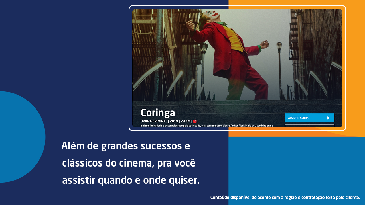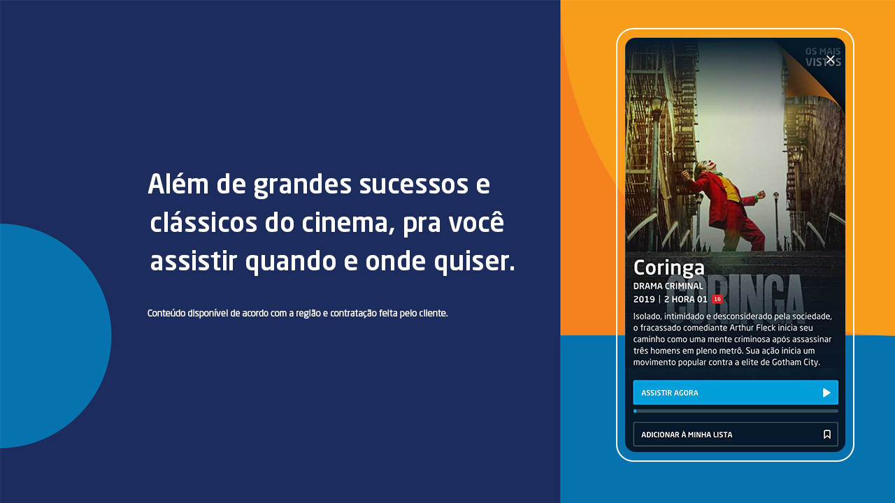 • FILMES E SÉRIESOs principais lançamentos, clássicos do cinema, sucessos internacionais e nacionais estão aqui. Tem Harry Potter, De Pernas pro Ar, Minha Mãe é Uma Peça, Jumanji, Coringa, Aves de Rapina, As Panteras, Homem-Aranha, Bloodshot, Hellboy e muito mais.