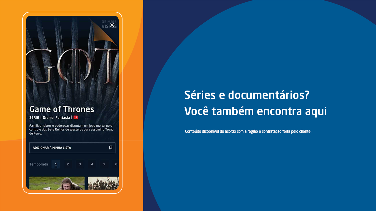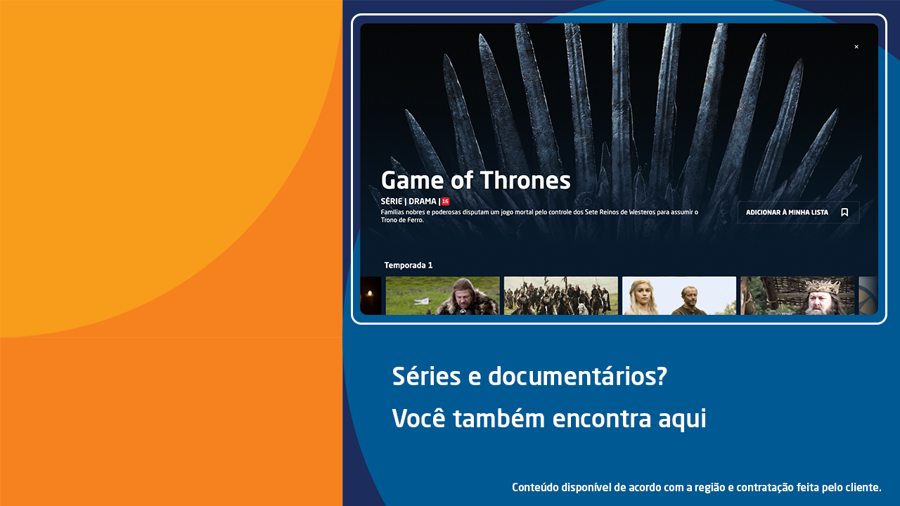 E a gente não poderia esquecer das suas séries favoritas. São diversos conteúdos pra maratonar, como Game Of Thrones, This Is Us, The Handmaid’s Tale, Outlander, War Of the Worlds, The Undoing, Westworld, Absentia e Chernobyl.