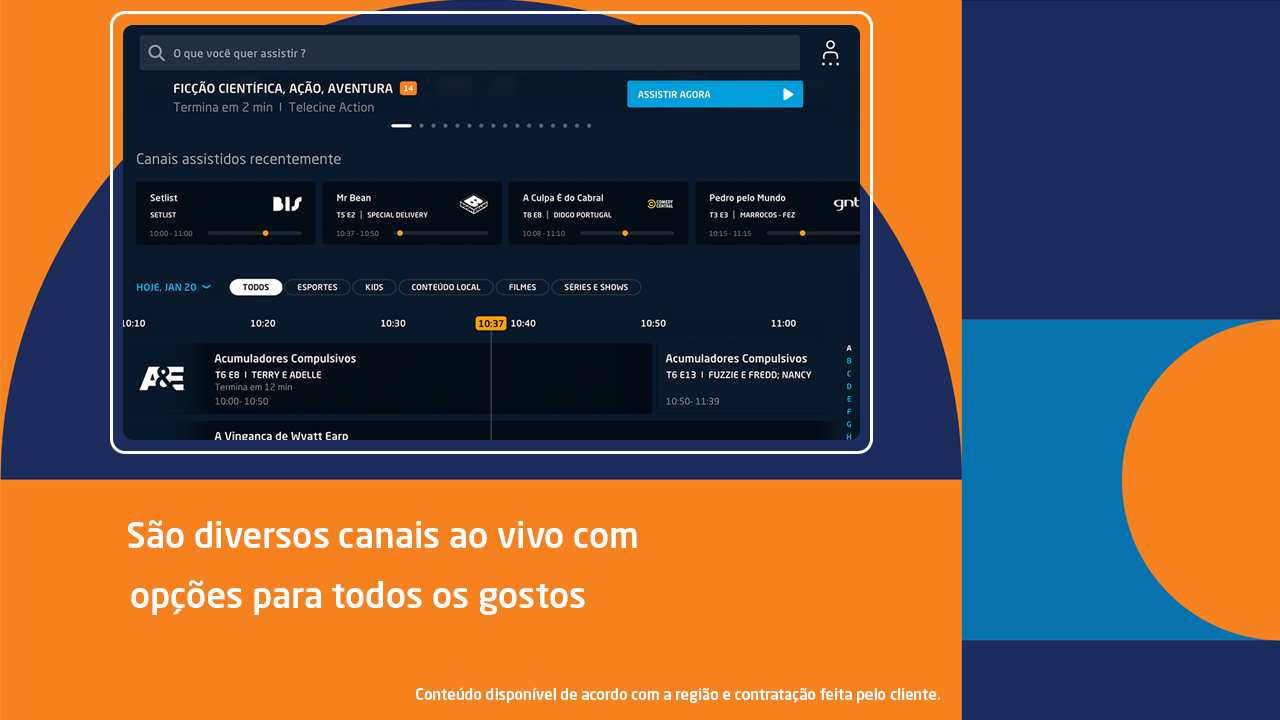 • TV AO VIVOA programação ao vivo pra você assistir quando e onde quiser. São canais que variam de acordo com o seu plano e a região onde você mora.