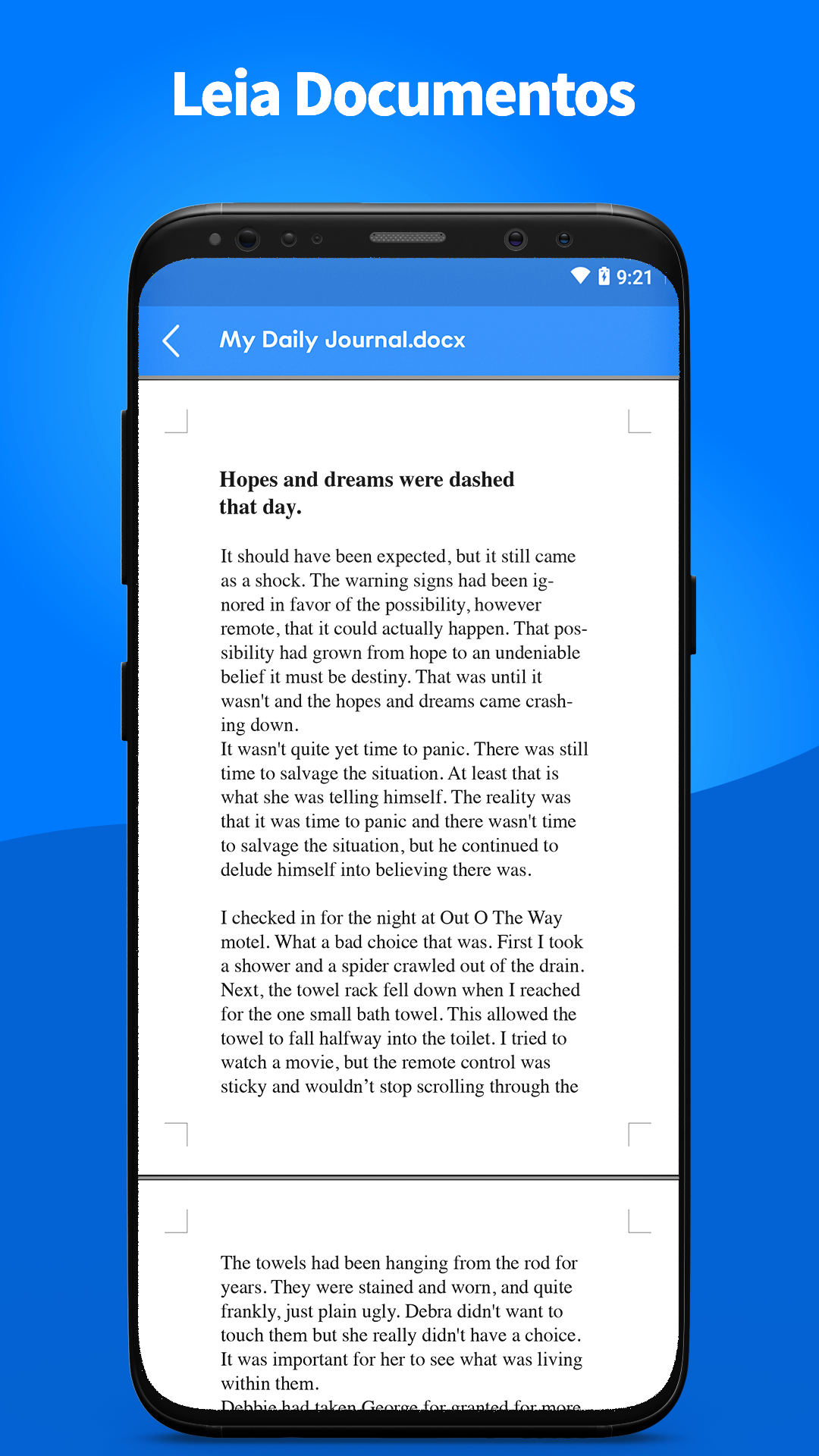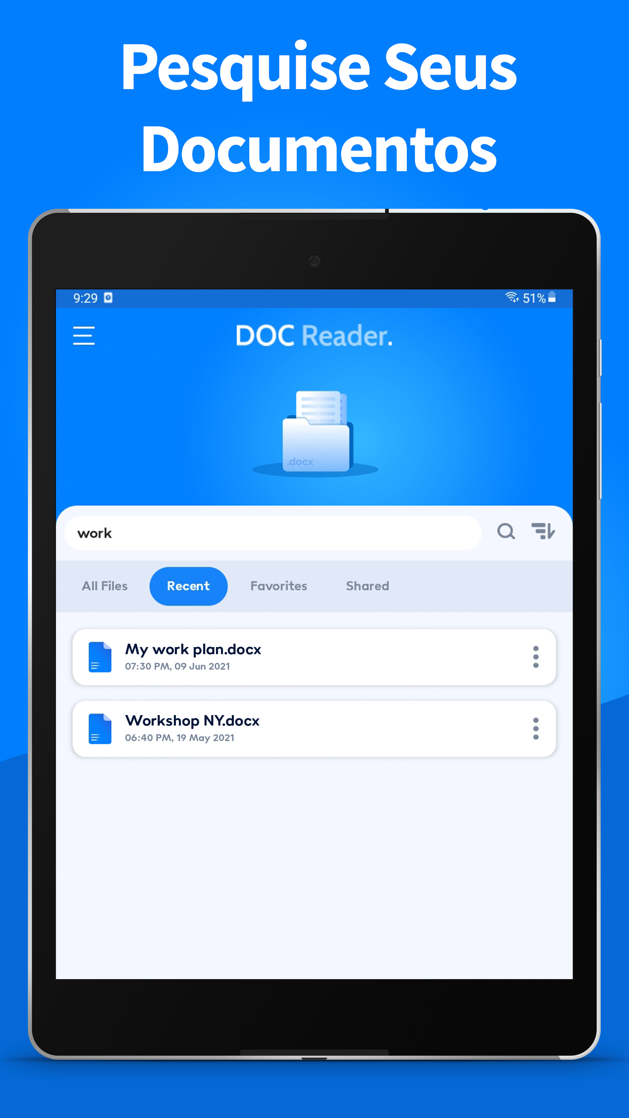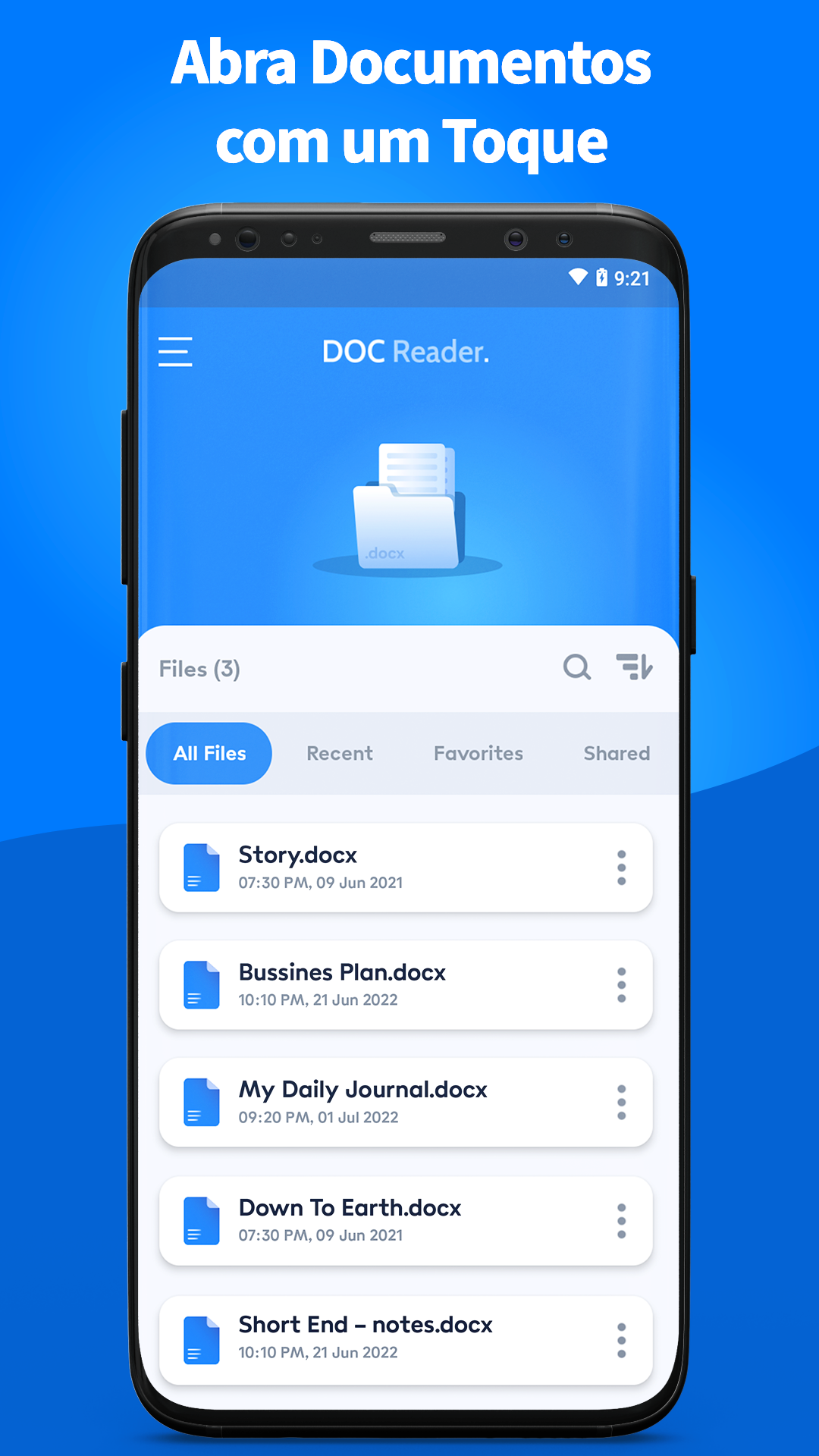 O Doc Reader é uma ferramenta poderosa para ler diferentes documentos do Office, como word, doc, docx e muitos mais. Ele é um aplicativo visualizador de arquivos simples, rápido e leve, com muitas opções. Gerencie seus documentos com apenas um toque, mesmo sem conexão com a internet diretamente no seu dispositivo móvel. Nosso aplicativo foi desenvolvido para ser uma solução universal que funciona com todos os tipos de Documentos: Docx, Word, Excel, PDF, PPT, TXT, etc. Nos perguntamos: “O que um aplicativo universal deve fazer e quais funções devem estar lá?”. Não queremos que você pule de aba em aba para ler ou visualizar arquivos em um aplicativo para "abrir arquivos XLSX ou docx adequado" separado. Gostaríamos de fornecer a você a conveniência de ler qualquer documento sem precisar quebrar a cabeça para descobrir como fazer isso no seu dispositivo. Você precisa ler arquivos MS Word ou PDF? Sem problemas! Você precisa abrir a tabela do Excel? Não tem problema, basta encontrá-la e editar! Temos tudo em um único produto! Então, vamos ver a versão resumida de nossas vantagens: • Um aplicativo que tem tudo o que você precisa em relação aos Arquivos do MS Office • Funciona com docx, pdf, ppt, pptx, xlsx, txt e muito mais • Leitor de Arquivos Doc e Leitor de PDF • Visualizador de Excel e Word • Pesquisa rapidamente os seus arquivos docx • Elimina a necessidade de mudar de aplicativo • Faz você trabalhar com documentos MS mais rápido • Compartilha documentos com seus amigos e colegas • Todas as opções necessárias, como renomear, excluir, compartilhar etc. • Você pode usá-lo para trabalhar com documentos offline Se você quiser eliminar o trabalho de abrir dezenas de aplicativos simultaneamente apenas para ler e trabalhar com arquivos diferentes, baixe este aplicativo. Com o nosso aplicativo, será moleza para você! Rápido, confortável e com todas as funções que você deseja, o que mais precisamos? Este aplicativo visualizador de arquivos é totalmente compatível com arquivos do Word Office, incluindo arquivos do Word, Excel e Docx. Formatos de Documentos Compatível: • Documento do Word: DOC, DOCX, DOCS • Documento do Excel: XLS, XLSX • Documento de Apresentação/Slide: PPT, PPTX, PPS, PPSX • Outros Leitores do Word Office e Arquivos: TXT