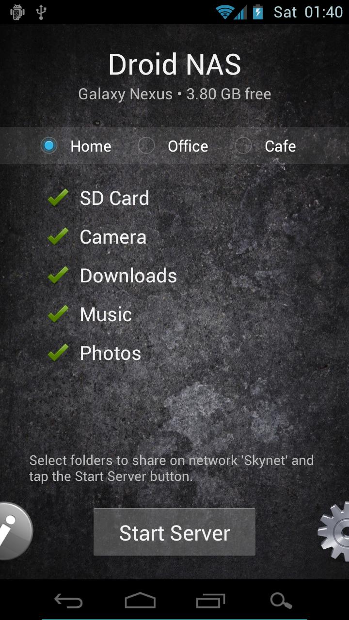 Different profiles can be used to quickly choose which folders to share. Assign your home or office Wi-Fi networks to profiles and Droid NAS will auto-select profiles on start.