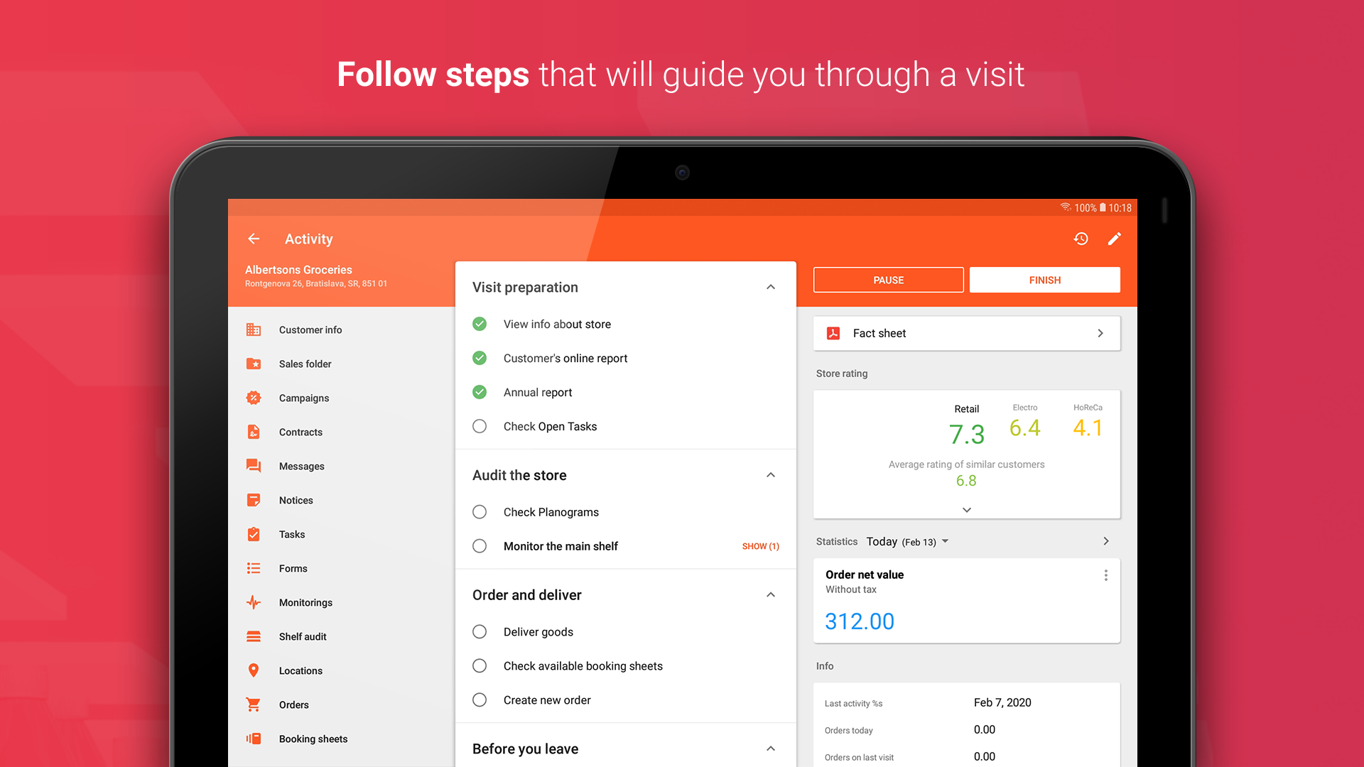 Cubra todo o processo, desde o planejamento até a entrega. Alcançar uma loja perfeita com os produtos certos nos locais certos. Solução flexível para atender a todas as suas necessidades de negócios, incluindo: * Gestão de clientes * Gestão de território * Rotas e planejamento de visitas ao cliente * Gerenciamento de campanha * Gerenciamento de tarefas * Colocação do pedido * Entrega e gestão de estoques * Retorna * Recebíveis e cobrança de dinheiro * Conformidade com o planograma * Auditoria de localização de produtos na loja * Auditoria de ativos comerciais * Metas e KPIs de loja perfeitos * Diário do motorista * Gerenciamento de estoque de armazém Tudo com um conjunto de interfaces padrão a serem integradas a outros sistemas. ______________________________________ Permissões usadas: * ler eventos de calendário além de informações confidenciais - para ser capaz de mostrar eventos de calendário pessoal junto com visitas planejadas de clientes * localização aproximada / precisa (GPS e com base na rede) - ser capaz de mostrar a localização do usuário no mapa e fornecer outros serviços com base na localização (por exemplo, informar que o usuário está localizado em um raio específico do cliente ou armazenar onde alguma ação específica relacionada à execução de varejo ocorrido) * ler e modificar o conteúdo do armazenamento USB - para ser capaz de ler / gravar configurações de conexão armazenadas na pasta AFS compartilhada e permitir que os usuários adicionem arquivos de armazenamento externo como anexos de documentos * tire fotos e grave vídeos - para oferecer suporte à leitura de código de barras com base na câmera (quando acionada manualmente pelo usuário) * visualizar conexões wi-fi e de rede, acesso total à rede - para ser capaz de se comunicar e sincronizar dados adequadamente com os servidores de execução de varejo ou enviar estatísticas de uso anônimas e relatórios de falhas para serviços de propriedade do Google * emparelhar com dispositivos Bluetooth, acessar as configurações de Bluetooth - para poder se conectar a vários dispositivos Bluetooth (por exemplo, impressoras ou leitores de código de barras externos) * controle de vibração - para fornecer feedback tátil em situações específicas (por exemplo, durante arrastar e soltar)