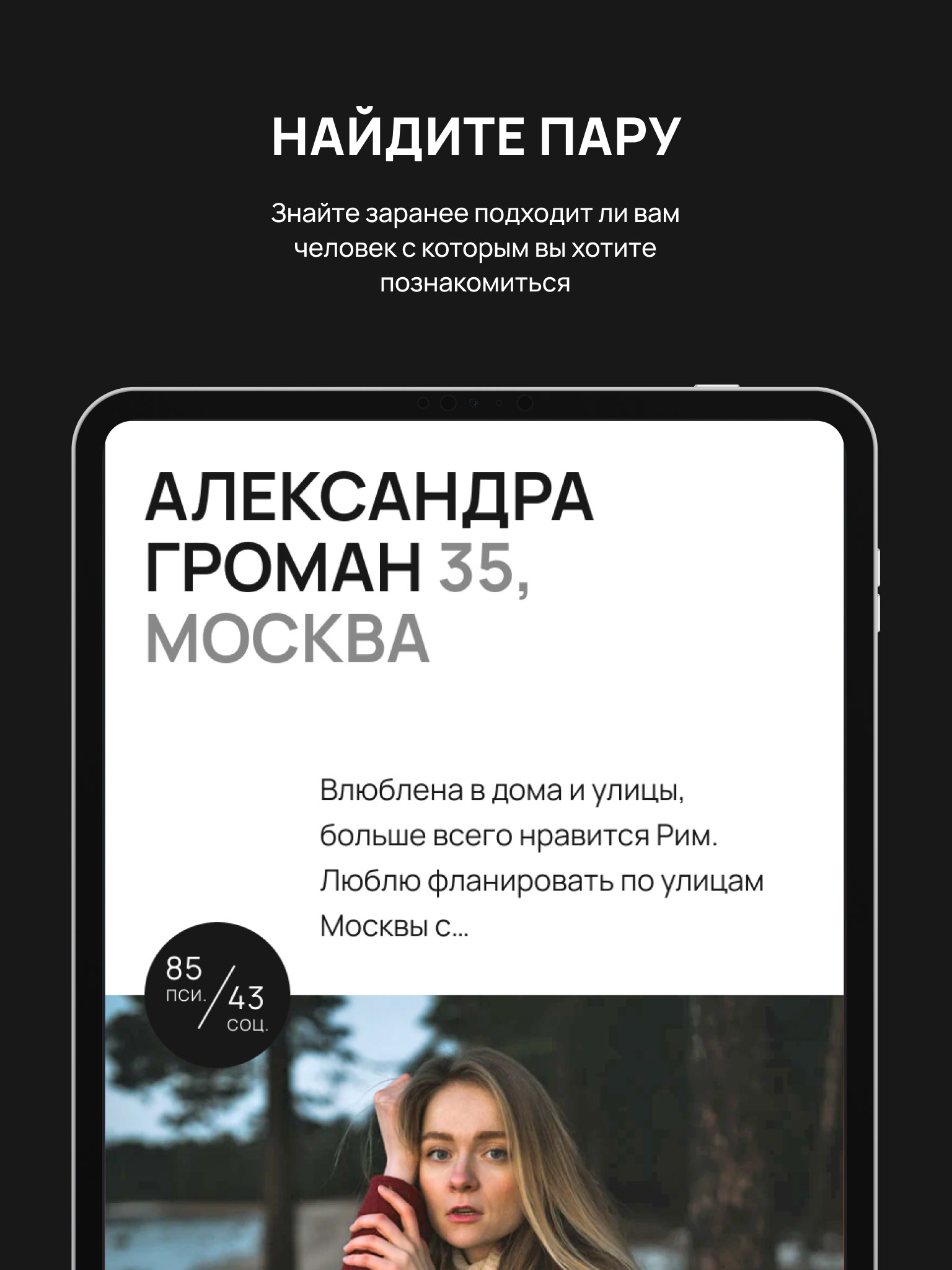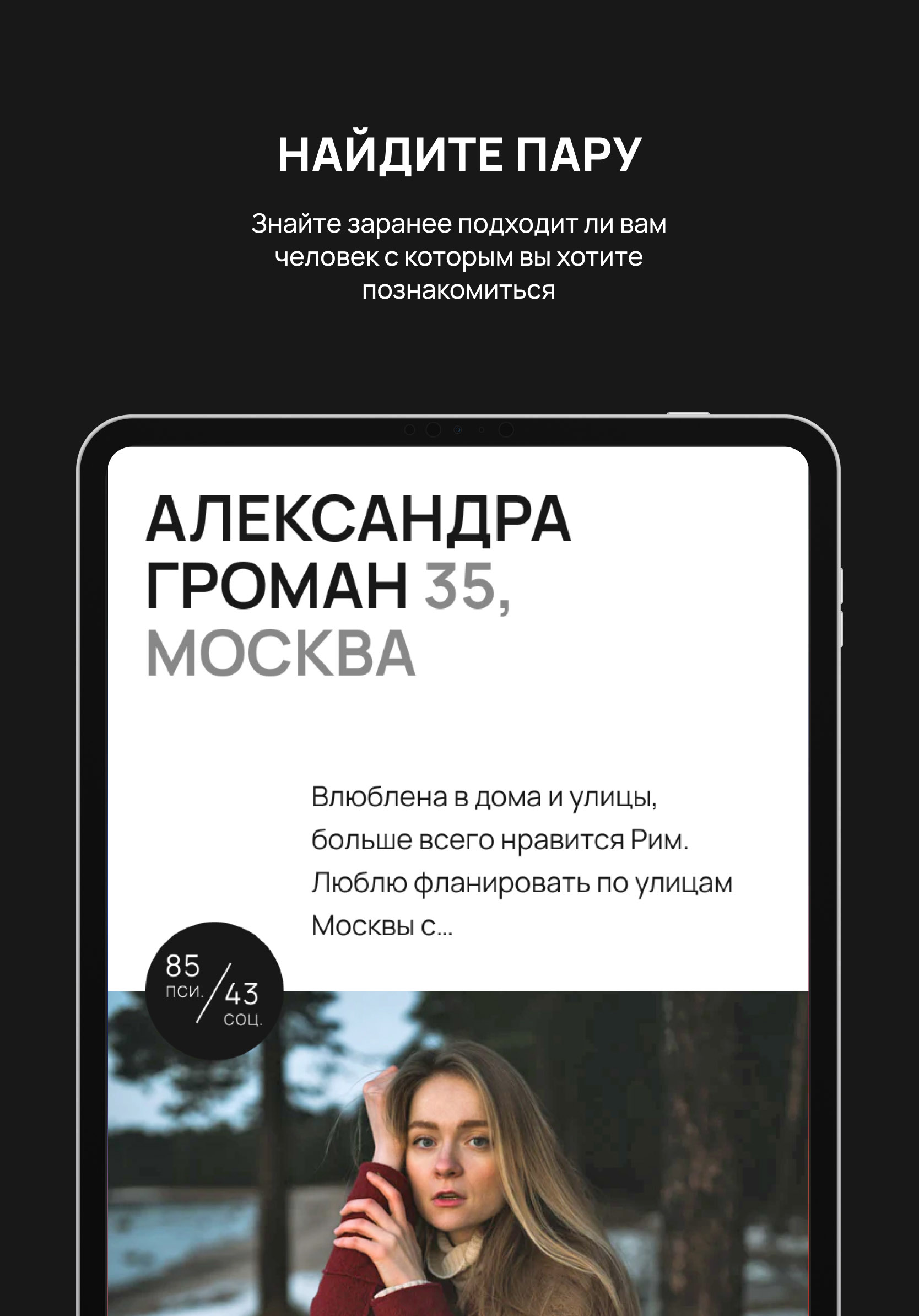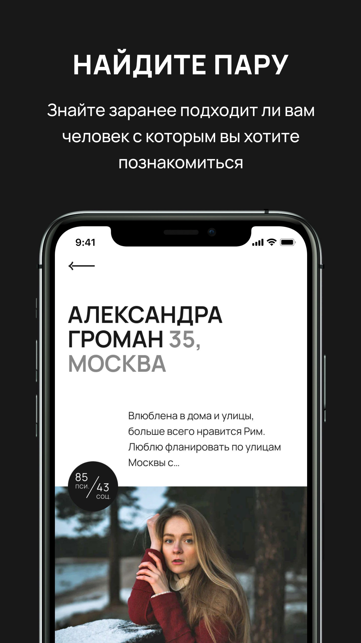 Мы помогаем строить здоровые отношения с человеком, с которым можно вместе развиваться. Всех людей в приложении объединяет цель — найти партнера для продолжительных отношений. Мы работаем с основами психологии для создания крепких семей, в которых не будет места разрушающим конфликтам и слов “мы совершенно разные и не подходим друг другу”.