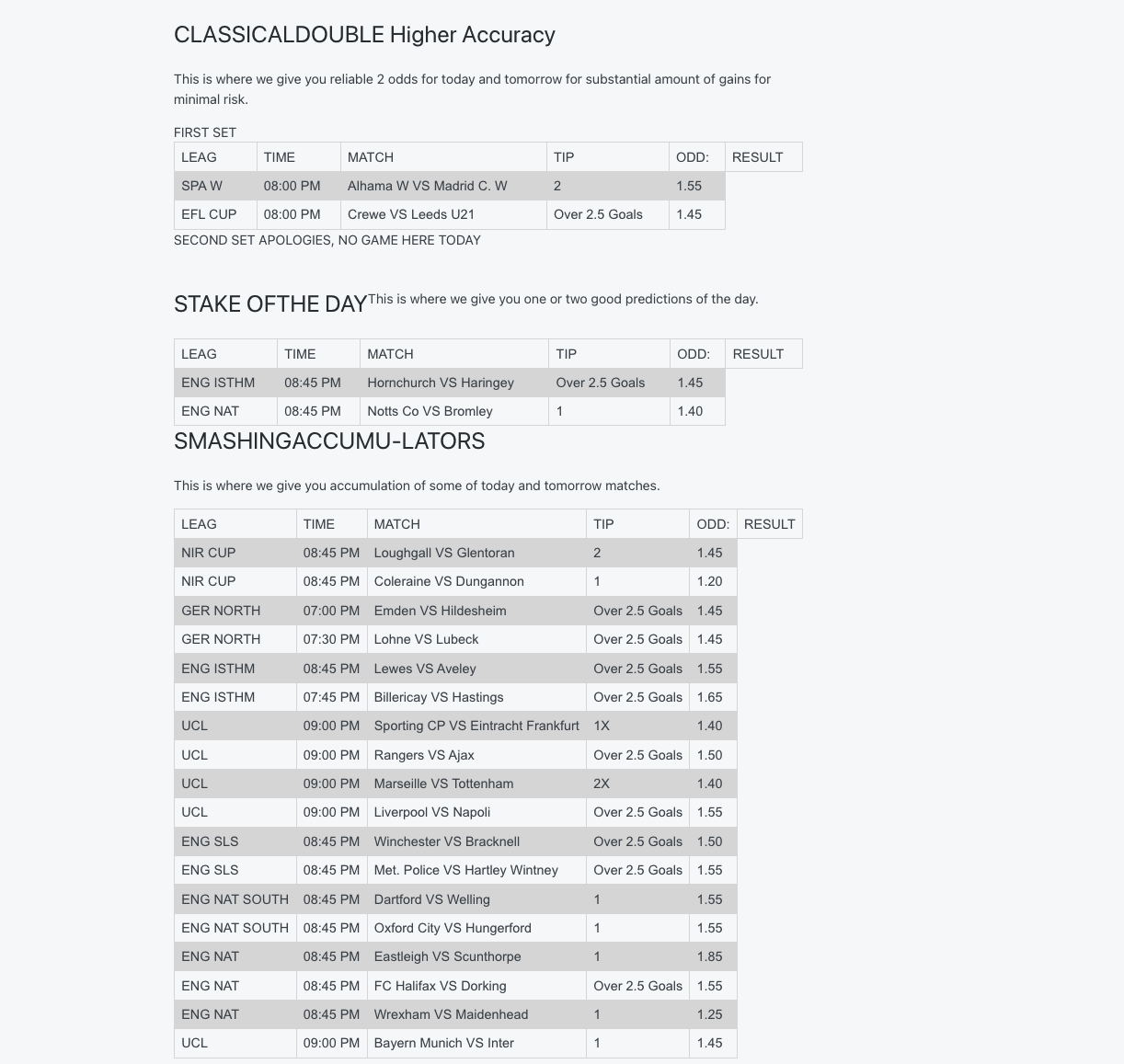Fixed Matches Correct Score é um aplicativo gratuito de previsões e dicas de apostas que todo fã de jogos deve ter em seu gadget! A pontuação correta das partidas fixas deste aplicativo pode ser o resultado da investigação factual de mais de 190 associações e competições globais de futebol em todo o planeta. Nesse sentido, podemos realizar as apostas seguras mais ideais e uma alta taxa de sucesso em previsões de grandes chances. Que vantagem você terá ao apresentar nosso aplicativo! • Admittance Momento para nossas dicas de apostas de aplicação de forma consistente. • Todas as dicas atualizadas de forma consistente. • Prime Safe Tips. • 5+ Chances por dia. • Dicas sob Outrageous. • HT/FT (dicas em tempo parcial/integral) • 10+ Chances por dia. • Pontuação correta. • Taxa de efeito de 90%! • Jogo único. • Pontas Duplas. CLASSICALDOUBLE Maior Precisão É aqui que damos a você 2 probabilidades confiáveis para hoje e amanhã para uma quantidade substancial de ganhos com risco mínimo. APOIO DO DIA É aqui que damos a você uma ou duas boas previsões do dia. ACUMULADORES SMASHING É aqui que damos a você o acúmulo de algumas das partidas de hoje e amanhã. APOSTAS DE VALOR Estas são as nossas dicas para hoje, esta noite e amanhã sobre previsões valiosas. É aqui que prevemos algumas partidas únicas de probabilidades de mais de 1,70. COMBO Estas são as nossas dicas para hoje, esta noite e amanhã sobre as previsões de combinação. MEGA FINAL DE SEMANA É aqui que acumulamos algumas boas previsões de sexta a domingo 3 ODDSBANKER Maior Precisão É aqui que damos a você previsões de 3 probabilidades confiáveis para hoje e amanhã para bons lucros para aqueles que preferem menos risco. MEIO TEMPO/ TEMPO INTEGRAL Estas são as nossas dicas para hoje, esta noite e amanhã sobre as previsões do intervalo/tempo integral. CHANCE DUPLA Estas são as nossas dicas para hoje, esta noite e amanhã sobre previsões de dupla chance. 1X significa que o Home ganha ou empata. 2X significa Fora Ganha ou Empata E 12 significa Casa ou Fora Ou significa HANDICAP (0:1, 1:0) Estes são os nossos Tips para hoje, esta noite e amanhã nos prognósticos Handicap 1 GANHE AS DUAS PARTES Estas são as nossas dicas para hoje, esta noite e amanhã sobre previsões de vitórias em ambos os tempos. CASA PARA GANHAR AS DUAS PARTES. FORA PARA GANHAR AS DUAS PARTES 2.5 OBJETIVOS Estas são as nossas dicas para hoje, esta noite e amanhã sobre previsões de 2,5 gols. Mais de 2,5 gols significa que haverá mais de dois gols na partida, enquanto menos de 2,5 gols significa que haverá menos de 2 gols ou exatamente apenas 2 gols na partida.