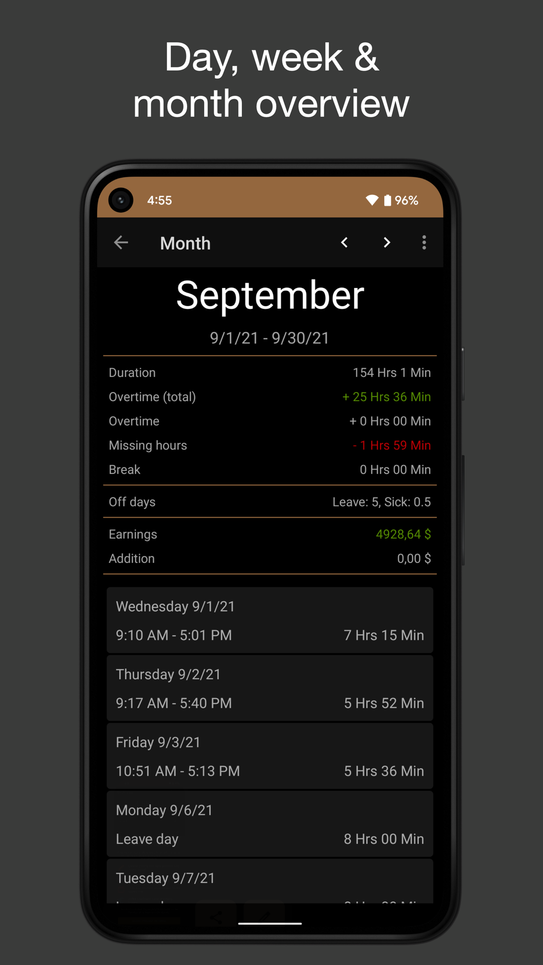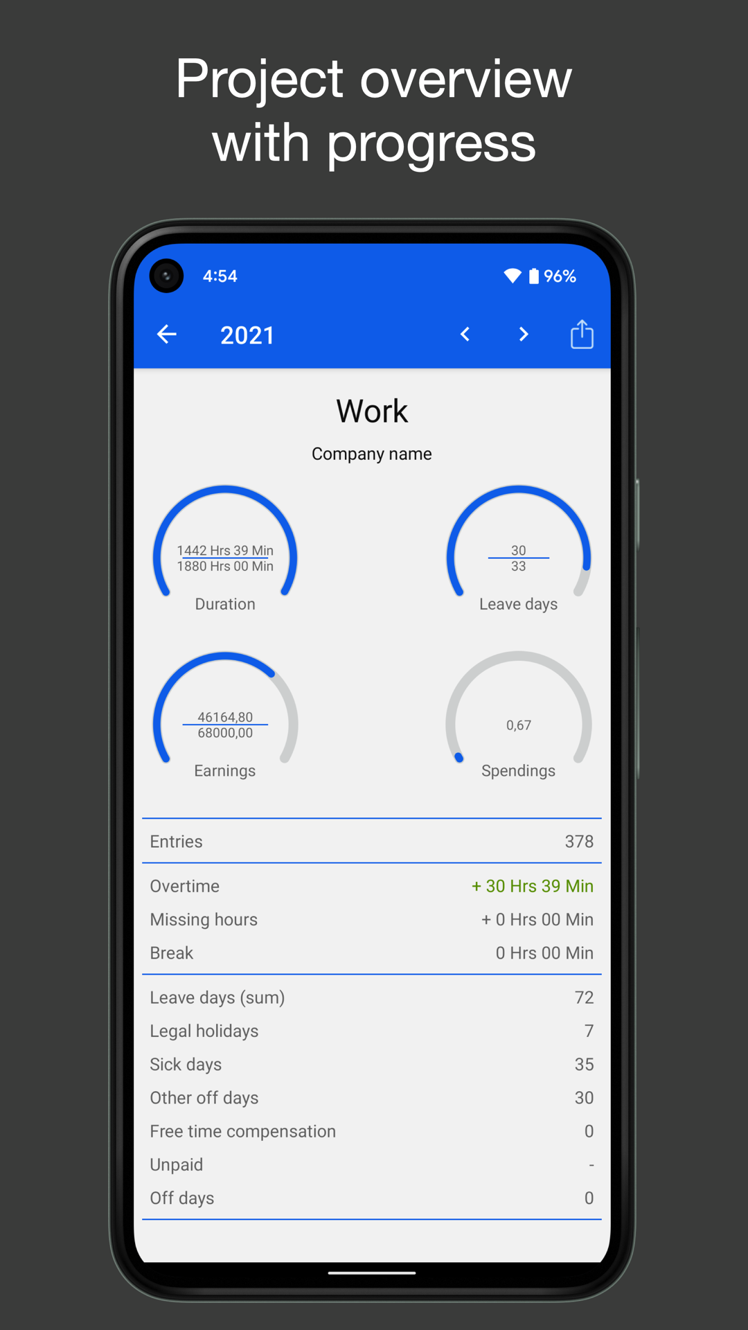- Visão geral de seus dias de férias, feriados, horas extras, horas de trabalho (diário, semanal, mensal ou anual)