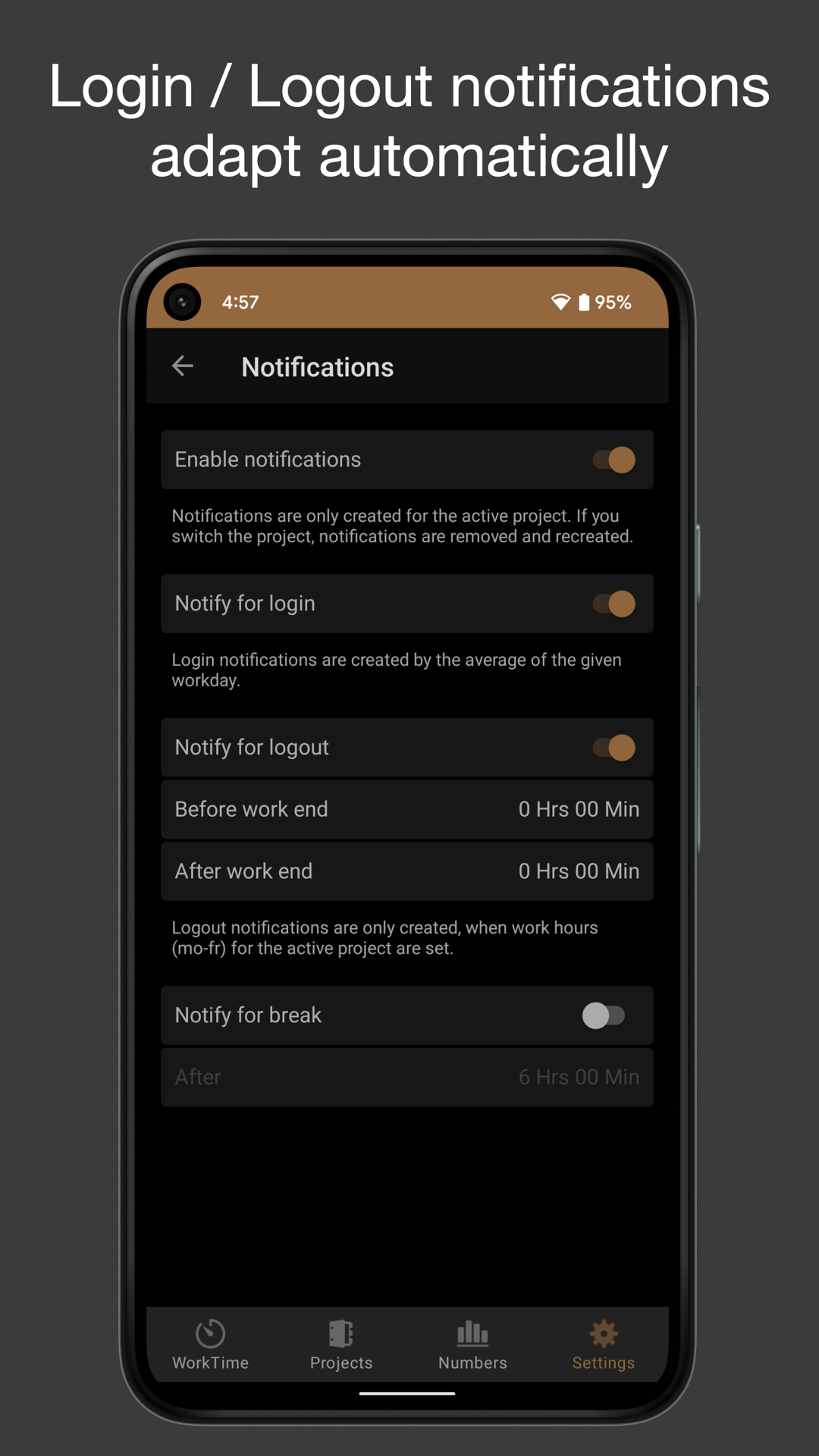 - Nunca se esqueça de fazer login / logout - FlexLog aprende com seu comportamento e lembra você de fazer login / logout todos os dias (Notificações)