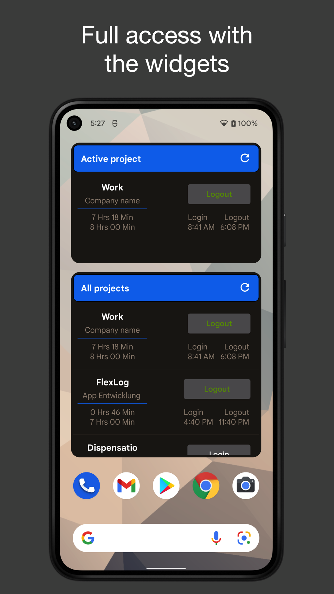 - Login / Logout e visão geral através do widget de hoje