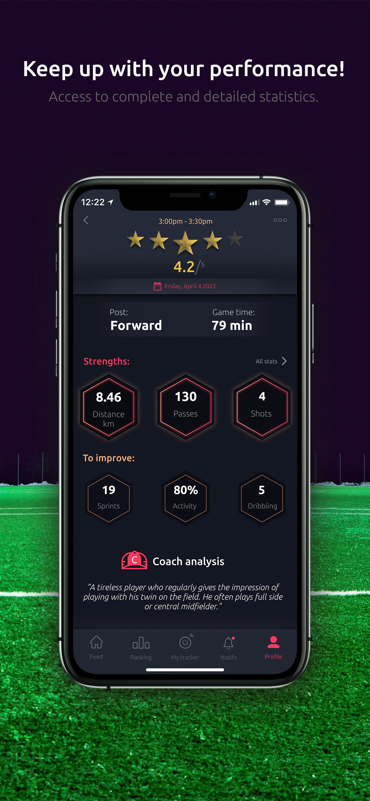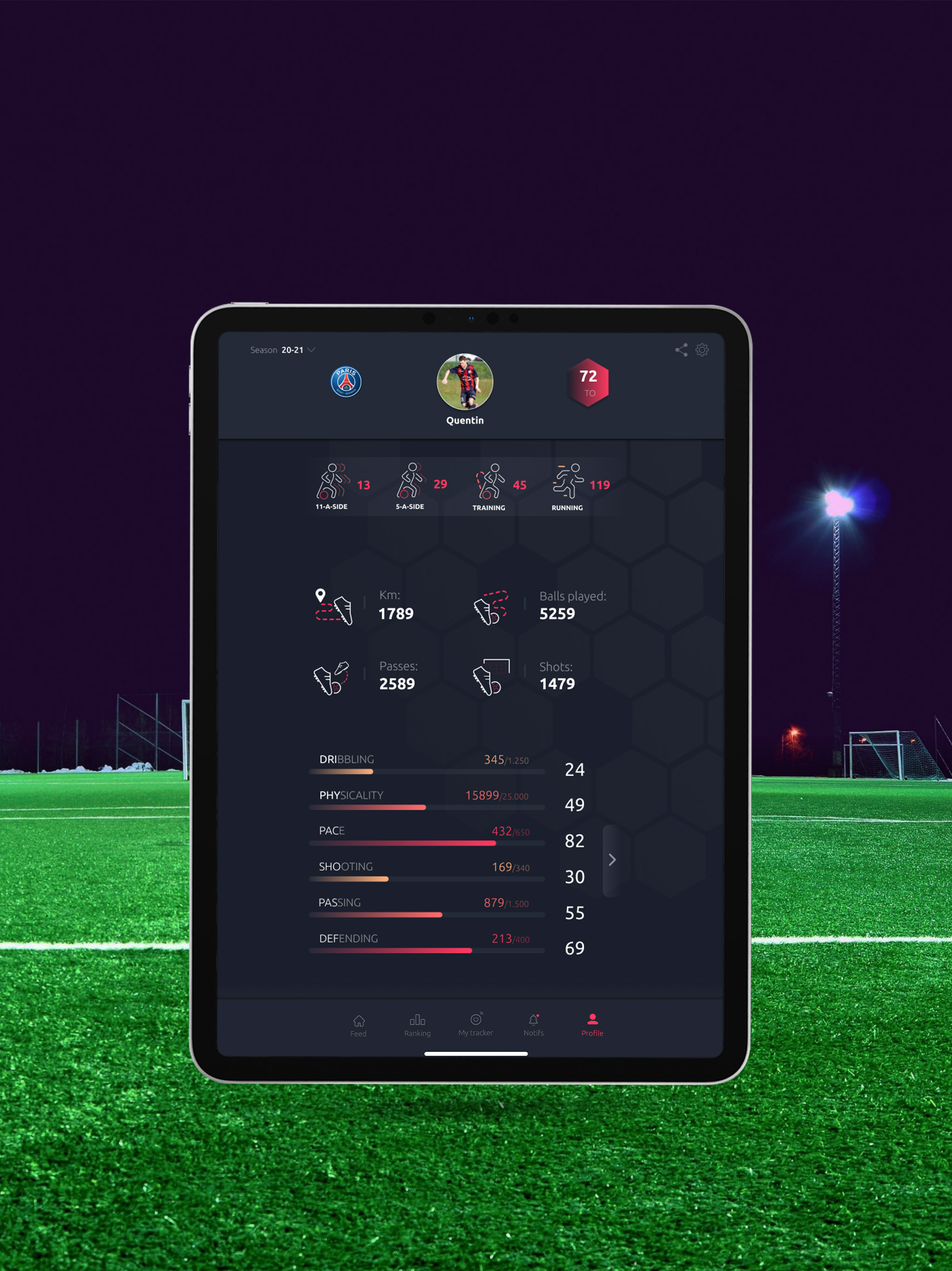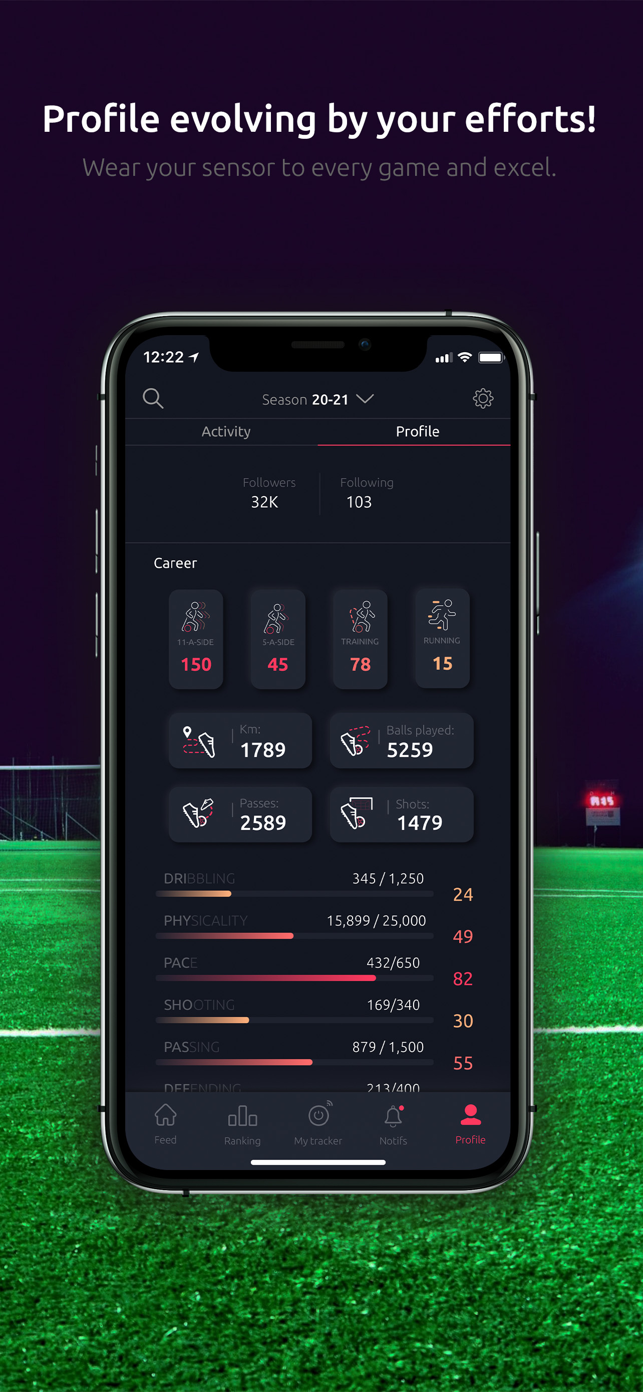 Nosso sensor, o Meteor, permitirá que você tenha suas estatísticas como seus quilômetros percorridos, sua velocidade etc. Além dessas estatísticas físicas, você poderá ver seu número de passes, seu número de tiros, seu poder de tiro e muitos outras estatísticas técnicas!