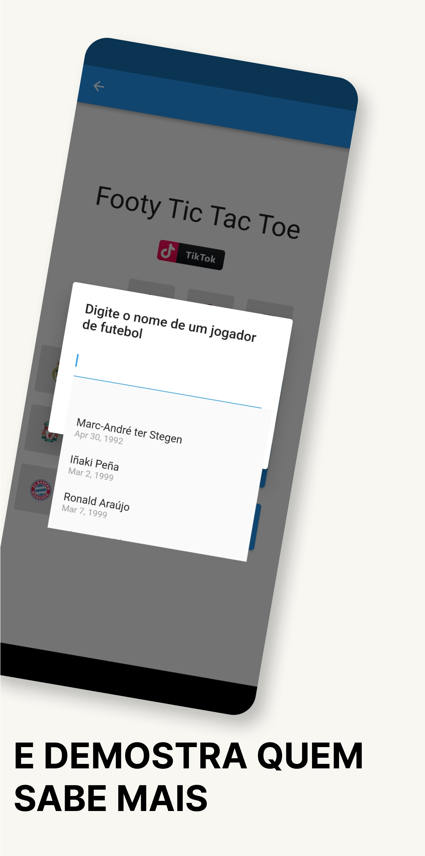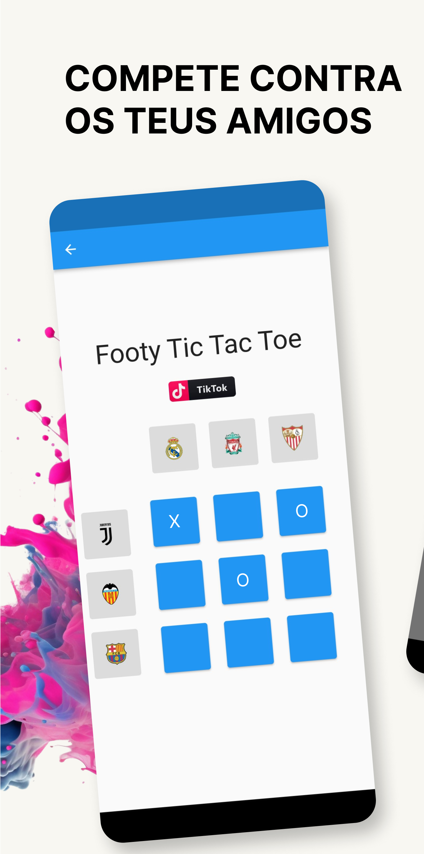 📱🎮Jogue Tic Tac Toe de Futebol no seu dispositivo móvel!🤖⚽️ Você é um fã do jogo da velha? Quer testar suas habilidades em um divertido jogo de Tic Tac Toe com um toque de futebol? Experimente o Footy Tic Tac Toe!👀 👥 Jogue com amigos no mesmo dispositivo ou contra a IA neste incrível jogo da velha de futebol 🌐 Como jogar Footy Tic Tac Toe? 👉Cada jogador é X ou O👈 🔍Você só pode colocar sua marca se puder nomear um jogador de futebol dos dois clubes correspondentes 🏆 O primeiro jogador que conseguir 3 marcas em linha ganha! 🏆 O jogo inclui: - Tic Tac Toe da Kings League 👑 - Tic Tac Toe de equipes internacionais 🌎 - Jogo da velha da Argentina 🥅 - Tic Tac Toe da Itália 🤌 - Tic Tac Toe da Espanha 🚀 - Jogo da velha da Inglaterra 💂 - Jogo da velha da Alemanha 🏰 Mostre quem manda no melhor jogo da velha de futebol. Baixe agora o Footy Tic Tac Toe e torne-se o mestre do Tic Tac Toe de Futebol. Não espere mais para desfrutar deste emocionante jogo de estratégia e futebol no seu dispositivo móvel.⚽