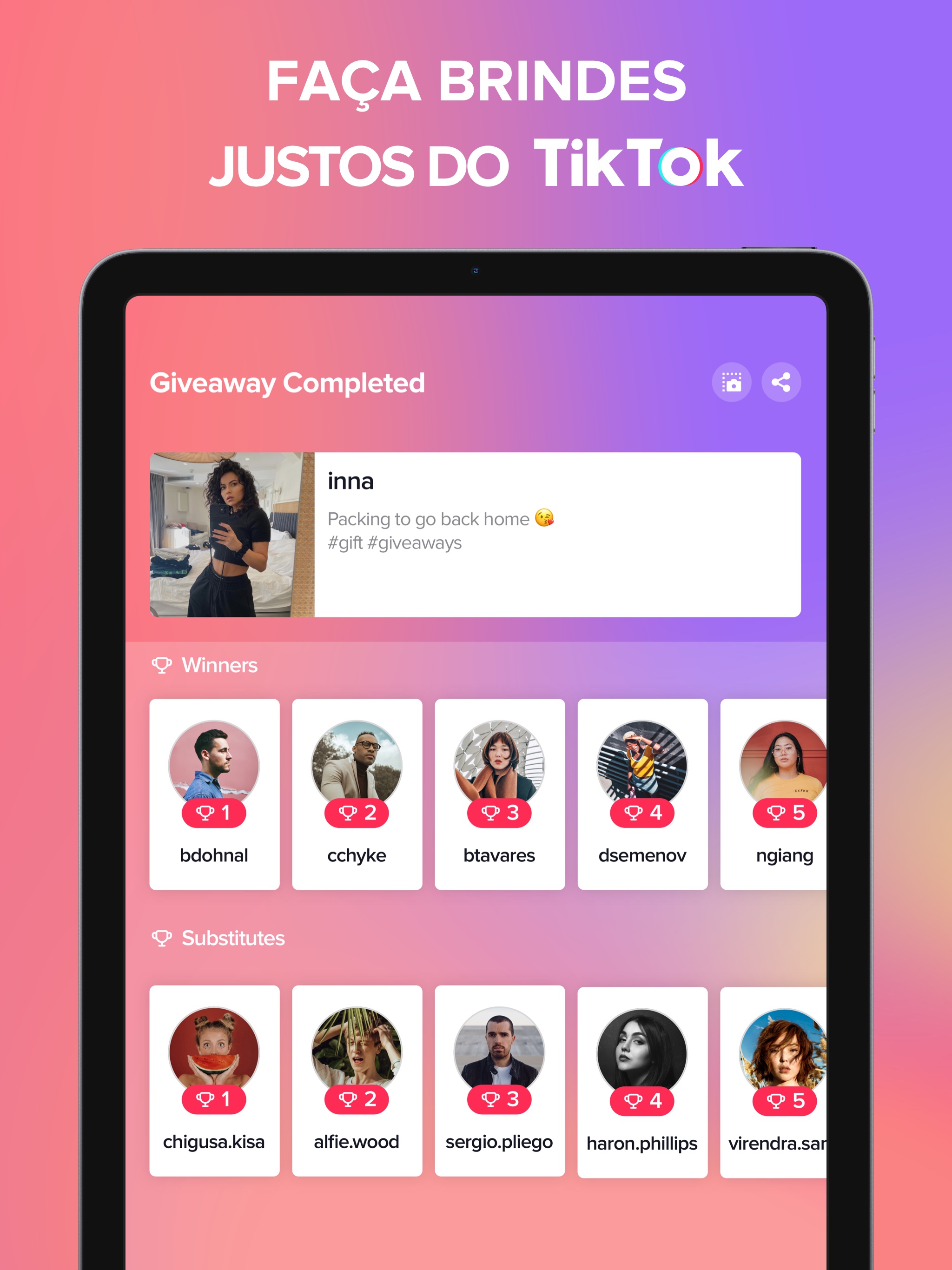 O Sortear TikTok Comentarios é uma ferramenta de seleção de brindes simples e eficaz para ajudá-lo a realizar brindes de sucesso no TikTok ou. Escolha um vencedor entre os comentários de um post com apenas alguns cliques. Evite horas de trabalho manual apenas digitando a URL do seu post, selecionando o número de vencedores e respondendo os comentários manualmente