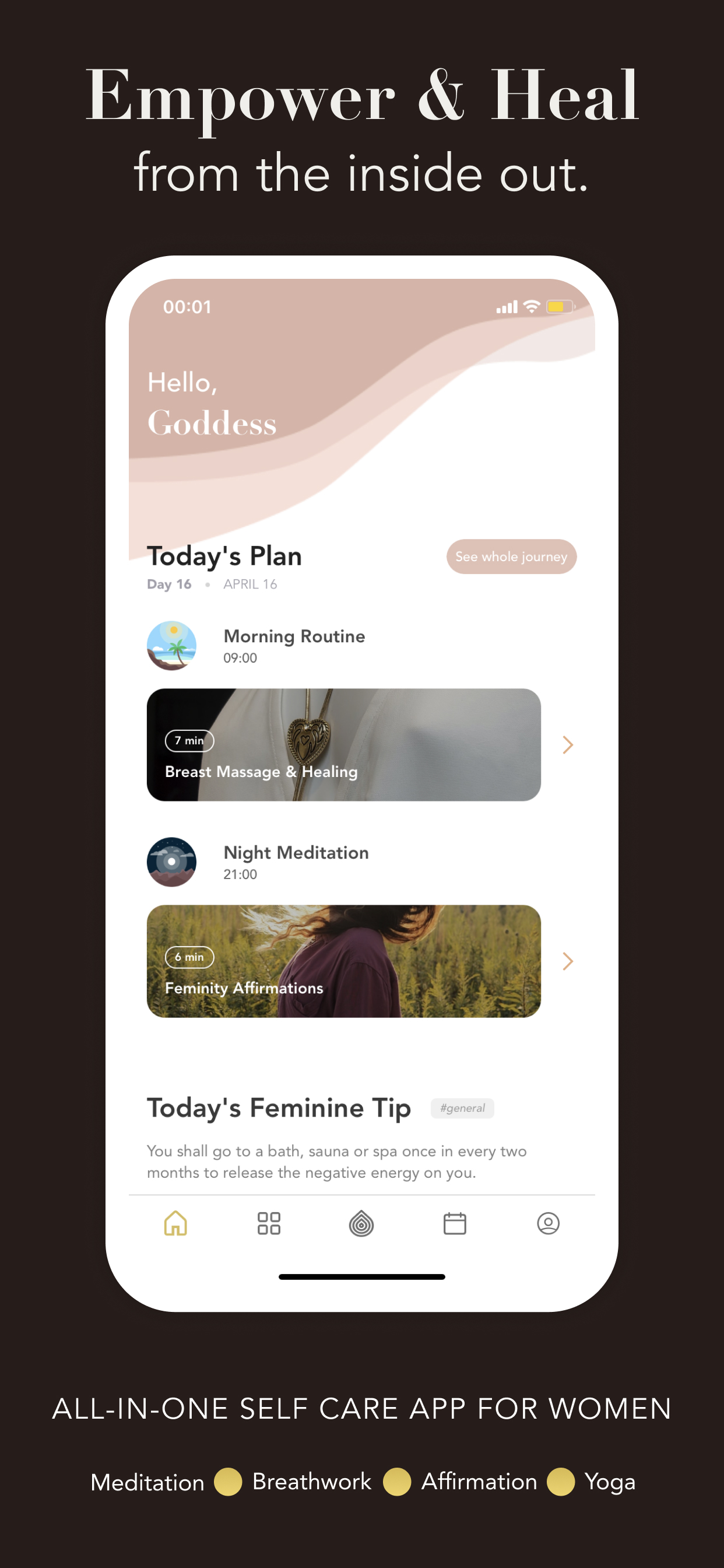 One day, every woman will be a Goddess! Join inner Goddess journey today with the Goddess app's well-being program and daily self-care routines due to your personality analysis. The only app that improves your self-love, heals the roots of every problem like stress,, depression, menstrual irregularity and even infertility with a customized program according to your characteristics and personality.