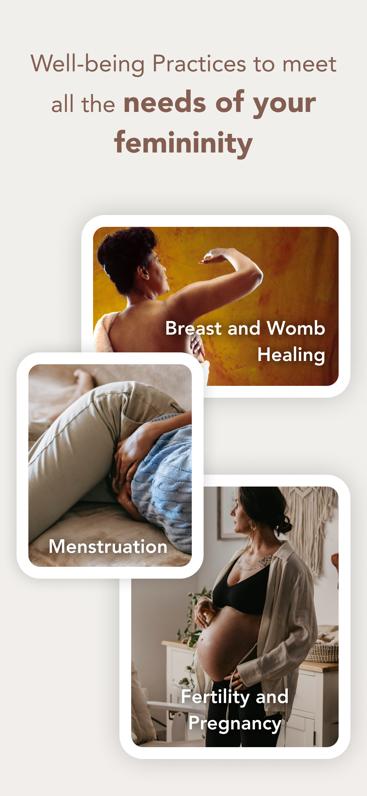 The well-being content in the app is exclusive for women. In your daily self-care routines, you will find Breast and Womb Massages, Menstrual Cycle Meditation, Womb Blessing Meditation, Femininity Affirmations, Fertility supporting exercises, and meditations targeting infertility problems. Besides, there is sleep meditation that makes you sleep in 5 minutes, breathwork (breathing exercises) to calm stress and anxiety, self-love practices to love yourself, love your body, embrace who you are.