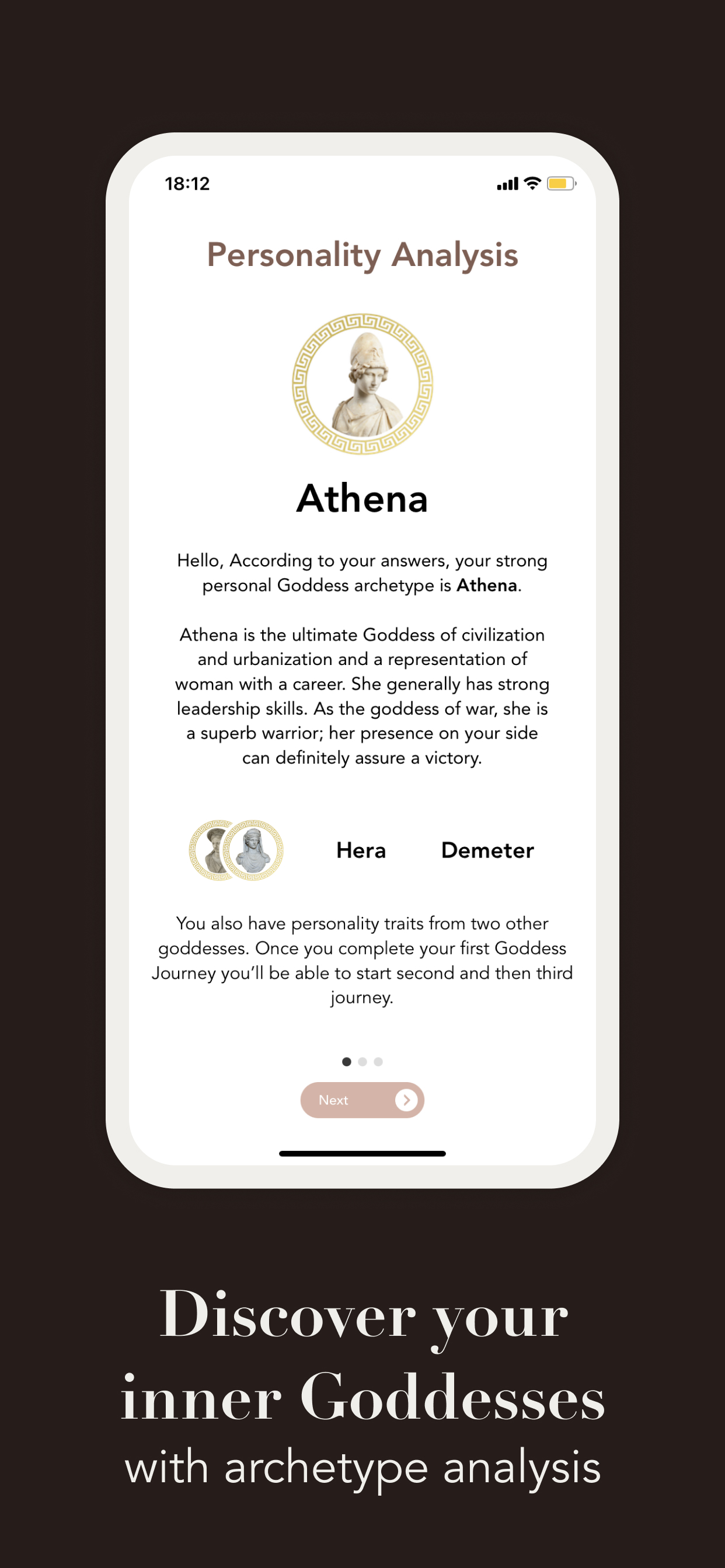 Goddess: Women's Wellbeing Coach App welcomes you with a Goddess Archetype quiz inspired by well-known psychologist Carl Gustav Jung's Archetypes of Mythology. This personality test indicates the unconscious Goddess energies that represent your characteristics, the real woman in you. Then, you will find a personalized well-being program that contains daily self-care routines, meditation, breathing exercises, affirmations, tips, and detailed personality analysis, transformation suggestions, and relationship tips.