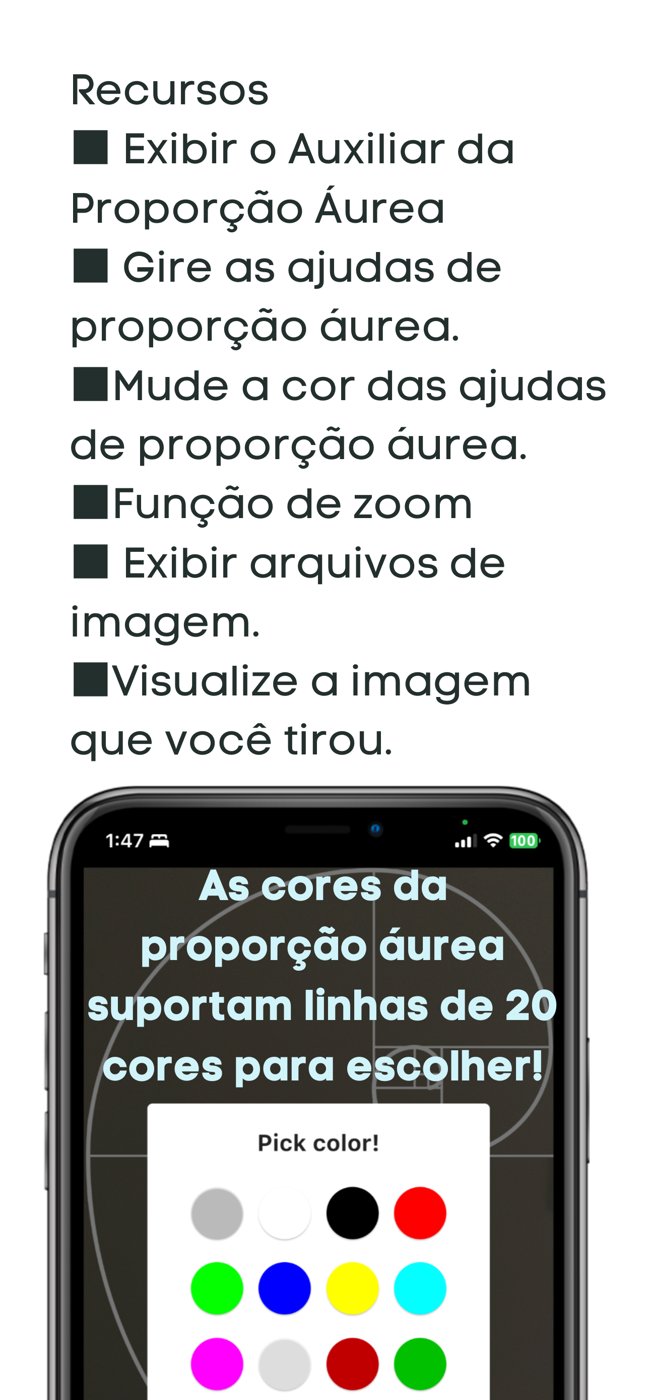 Um aplicativo de câmera com linhas auxiliares para a proporção áurea. Com este aplicativo, qualquer pessoa pode facilmente tirar fotos usando a proporção áurea. As linhas auxiliares da proporção áurea podem ser orientadas para cima, para baixo, para a esquerda ou para a direita. ■Qual é a proporção áurea? Matematicamente, a proporção áurea é um valor constante na sequência de Fibonacci, que é uma sequência infinita de números. Quando cada termo é a soma dos dois termos anteriores, a proporção de cada termo dividido pelo termo anterior sempre se aproxima de um valor constante, que às vezes é chamado de proporção áurea. A proporção áurea é de aproximadamente 1,618. A proporção áurea é considerada uma bela proporção encontrada na natureza e em objetos feitos pelo homem, e é frequentemente usada em arte, arquitetura e design. A proporção áurea também é às vezes chamada de câmera de proporção áurea ou tela de proporção áurea, que é construída de modo que a proporção do lado mais longo para o lado mais curto seja 1:0,618. Diz-se que Eudoxos (ca. 408 aC - 355 aC) descobriu a proporção áurea, que mais tarde foi usada pela primeira vez pelo antigo escultor grego Pheidias quando ele construiu o Partenon. A proporção áurea foi descoberta por Eudoxus (cerca de 408 aC - 355 aC), e mais tarde usada pela primeira vez pelo antigo escultor grego Pheidias quando ele construiu o Partenon. O termo "proporção áurea" apareceu pela primeira vez em um livro publicado em 1835 pelo matemático alemão Martin Ohm, e a "proporção áurea" tornou-se amplamente conhecida como a proporção que os humanos acham mais bonita. ■ A proporção áurea é usada em A proporção áurea também é usada na Vênus de Milo, no Arco do Triunfo em Paris, na Mona Lisa (Leonardo da Vinci), nas Pirâmides, ruínas gregas, na Catedral da Sagrada Família, no Parthenon, no Edifício das Nações Unidas em Nova York, o Templo Kinkakuji, o Castelo de Osaka, as 36 vistas do Monte Fuji "Kanagawa Okinoura" (Katsushika Hokusai) no Japão e muitas outras obras. A proporção áurea também é usada no logotipo da maçã da Apple. A proporção áurea também é usada no logotipo da Apple, iPods e muitos outros produtos da Apple, logotipo do Google, logotipo do Twitter, cartões de visita e cartões de crédito. ■Funções 1. A Proporção Áurea é uma relação entre o lado mais longo e o lado mais curto de uma imagem. 2. Rotação das linhas auxiliares da proporção áurea 3. Gire os auxiliares de proporção áurea. 4. Função de zoom 5. Exibição de arquivos de imagem 6. Visualização de imagens tiradas com a câmera. ■Casos de uso 1. uso da proporção áurea em arte e design Em arte e design, a proporção áurea pode ser usada para criar obras de arte mais bonitas. Além disso, na arquitetura, a proporção áurea pode ser usada para criar edifícios mais equilibrados e uma arquitetura mais bonita. 2. casos de uso da proporção áurea no design da interface do usuário A proporção áurea às vezes é usada em design de tela e interface. Usando a proporção áurea, podemos criar interfaces com melhor visibilidade e facilidade de uso. 3. Casos em que a proporção áurea é usada em composições de fotos e vídeos, logotipos, branding, etc. Ao usar a proporção áurea, você pode criar uma obra de arte mais visível e impressionante.
