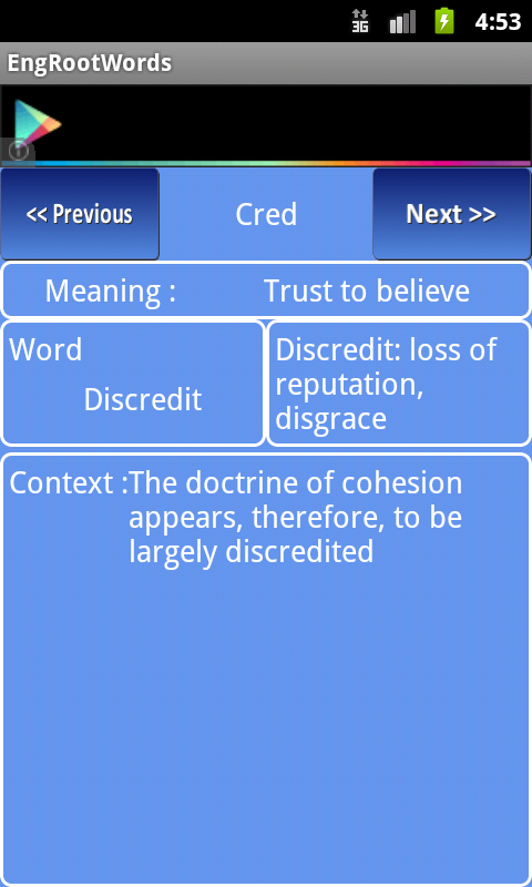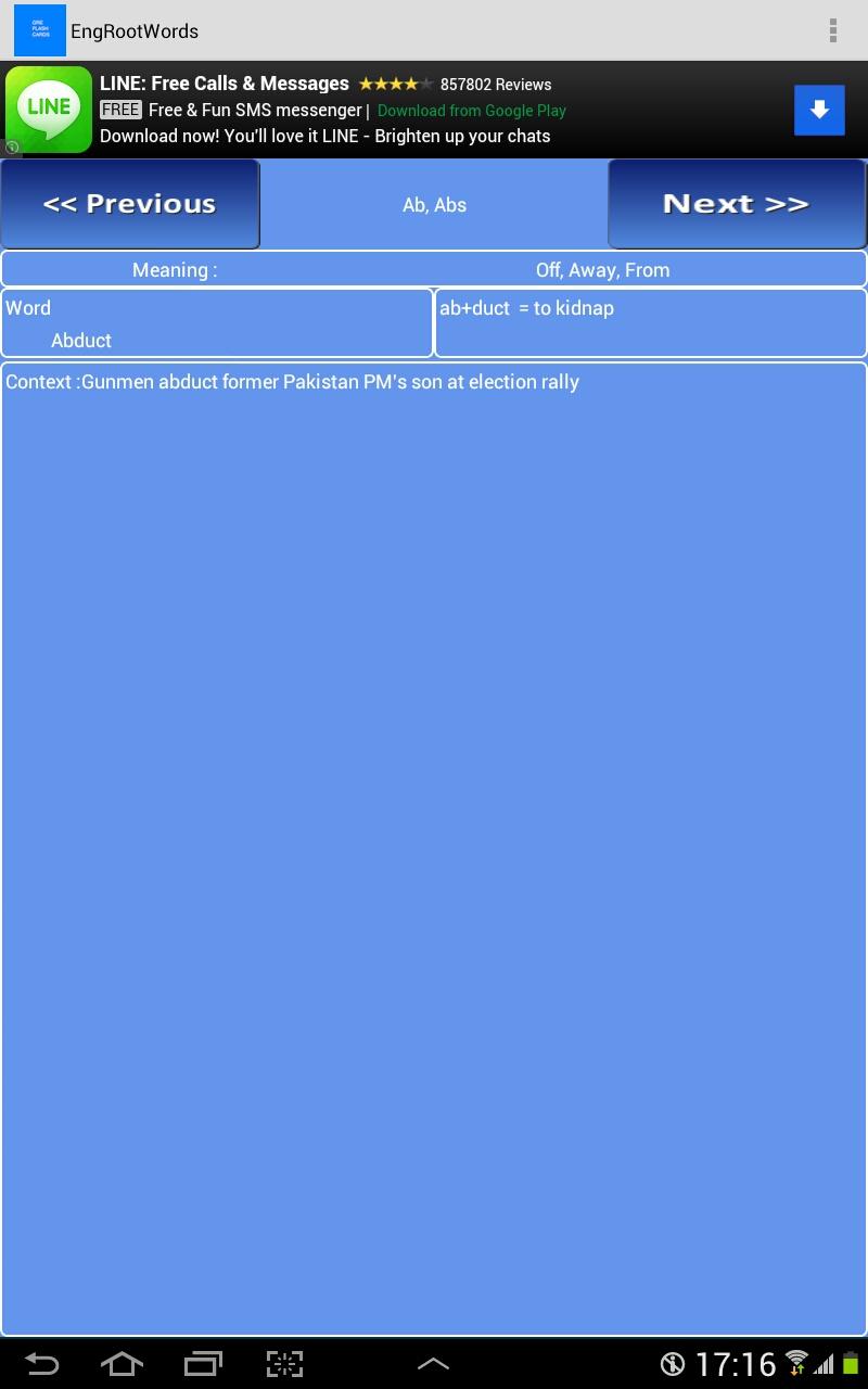 The app has a list of commonly used root words, their meanings and some examples of words formed using these root words and also usage of words in sentence.