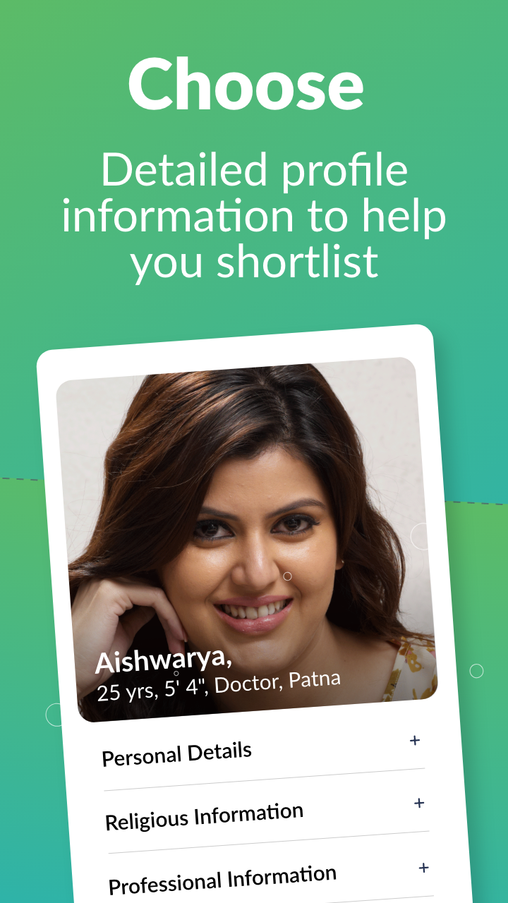 • Informações completas do perfil - Visualize informações completas do perfil, como instituto educacional, empresa e horóscopo/kundali.