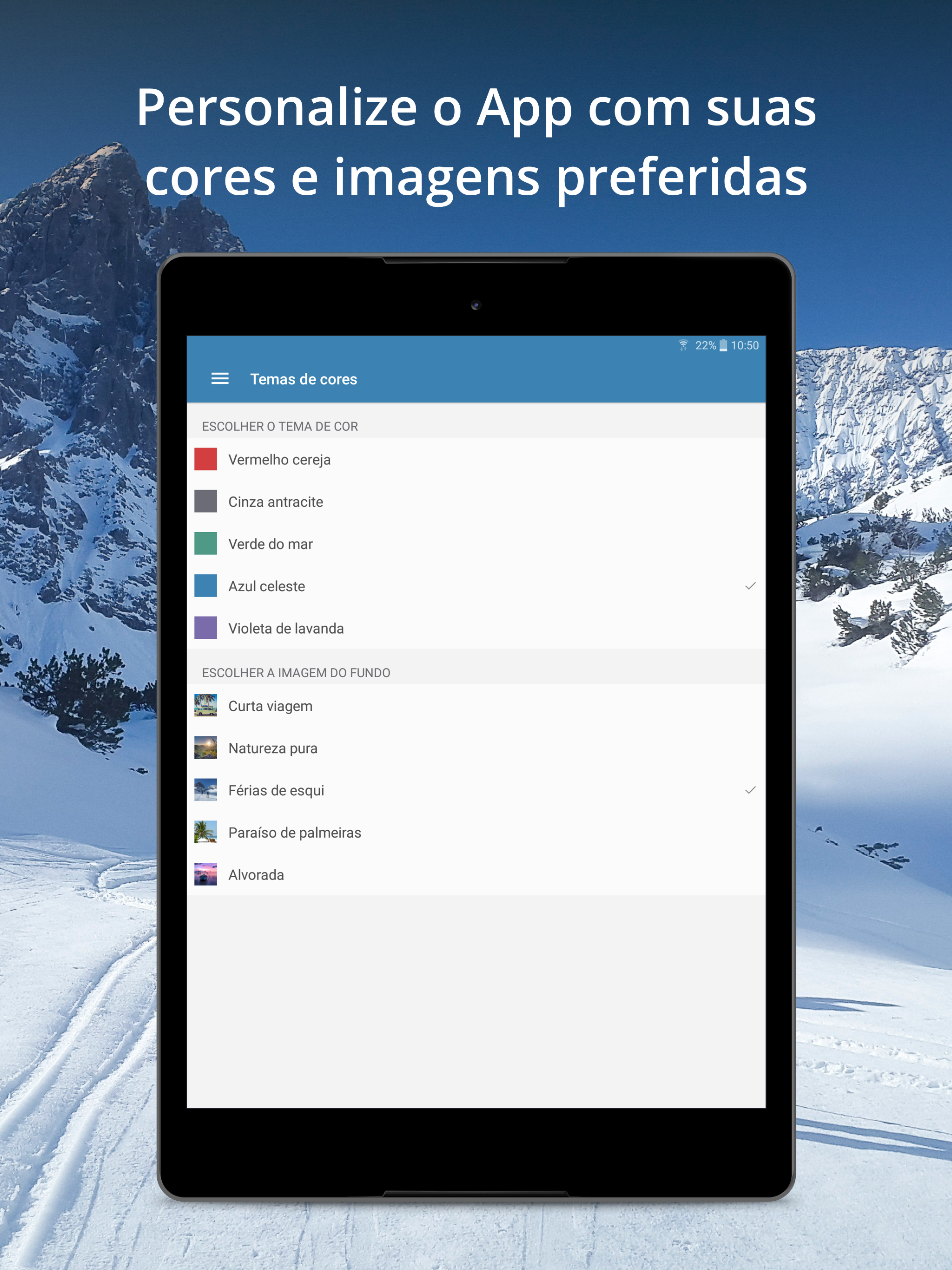 Personalize o App Calendário de Feriados e Férias escolares escolhendo sua cor e imagem favorita.
