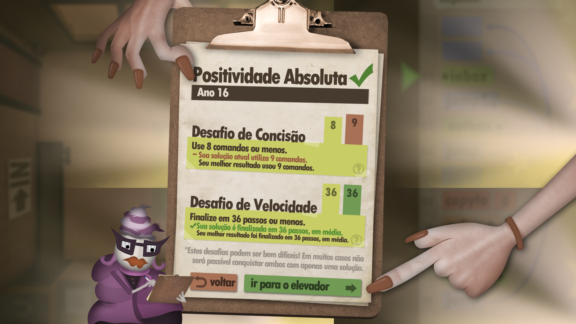 Crie programas para que o trabalhador de escritório resolva os desafios. Seja um bom funcionário! As máquinas estão chegando... para roubar seu emprego. Human Resource Machine é um puzzle para nerds. A cada fase seu supervisor lhe dá uma tarefa. Programe seu pequeno funcionário para automatizá-la. Se tiver sucesso, será promovido para a próxima fase para mais um ano de trabalho no enorme prédio comercial. Parabéns! Não se preocupe se não souber nada de programação - programar é como solucionar quebra-cabeças. Se tirar os uns, zeros, colchetes e chaves, verá que programação é algo simples, lógico, lindo e que todos podem aprender e se divertir no processo! Se você já for um especialista, há desafios extras para você. Do criador de World of Goo e da equipe por trás de Little Inferno. Divirta-se! A direção está observando.