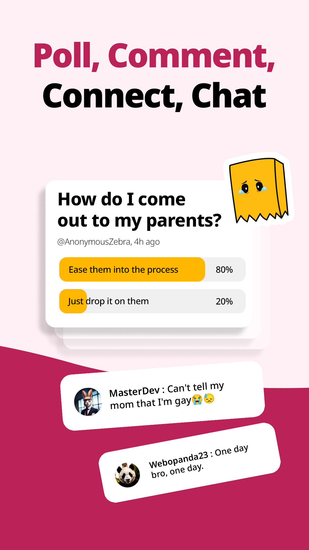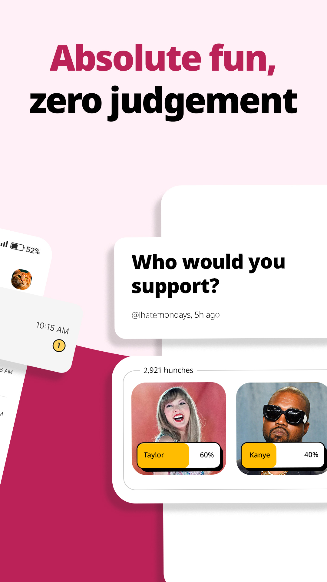 What if there was an anonymous app that could help you find like-minded friends? Enter Hunch, a polls-based anonymous social media app for GenZ. In a world where there is no right opinion, you can express your honest opinions, anonymously. Find like-minded homies in the comments, follow each other and start gossing! On Hunch, you can make new friends with shared interests while having fun and being yourself. Ask and answer questions or simply express what's on your mind. Hunch gives you the freedom to have fun, without worrying about saying the right opinion. Think of it as an anonymous social media app for teens that allows you to be your real self, talk anonymously over text with like-minded people online, and become friends with them. It's easier because when no one knows you, no one can judge you. You can also connect and make friends in comments sections where people are talking about your kind of interests. From Movies and TV Shows, Philosophy and Religion to Lifestyle. You can have fun with friends through anonymous questions, chat online about a wide range of topics on Hunch and find friends who think like you. So how exactly does Hunch differ from the other Genz social media app? 1. Anonymous: Hunch is a 100% anonymous social media app. So you can share your opinions exactly how you feel them without fear or judgment. When you share your authentic thoughts, you get to vibe with, meet like-minded people who understand you, and chat online on this friend making app for teens. You can also let your thoughts run wild, whether it's trivial musings or answers to questions you've always wanted to ask. Hunch is a Genz app, and we take your privacy very seriously. 2. Polls only: With a refreshing new format, hunch allows Genz to ask questions, drop dank takes or give your opinions on anything that interests you via polls. Find out what people think about your favorite topics and connect with those opinions that interest you. The comment section is public, so you can find friends based on similar opinions. 3. Goss: Hunch is an anonymous app for teens, you can find like-minded friends! When you drop your opinions, random confessions, or dank questions, hunchkins who vibe with you can comment and hunch on your polls. You both can follow each other or make the first move and send them a goss request for anonymous chat. So your identity stays a secret but you also connect with friends who share similar interests, use this friend making app and chat online. 4. Vibe Score: Genz opinions matter on hunch. For every poll you create, the comments and hunches you get, and the number of people engaging with your content contribute to your Vibe Score. The more people hunch on your content the more your popularity increases the more you can find new friends for anonymous chat. 5. Hunch+: It’s the premium tier of your favourite friend-finding platform. Hunch+ is designed for the Genz app user who craves a richer, ad-free experience with access to special features that enables people to find new friends and chat online. Hunch+ comes with weekly & monthly subscription plans. Subscriptions will automatically renew unless canceled within 24-hours before the end of the current period. You can cancel anytime with your Play Store account settings. Hunch lets you bring out your true personality and have honest conversations with people who have similar interests. Let your honest opinions do the talking, ask anonymous friends, do anonymous chat, talk anonymously, and have fun with friends who share similar kind of interests as you. Enjoy anonymous chat, find friends, make new friends, ask anonymous questions, drop anonymous comments, share random confessions, and talk anonymously on hunch. You can do this without changing anything about yourself, thanks to this friend making app! So what are you waiting for? Download Hunch and see how easy it is to make like-minded friends!